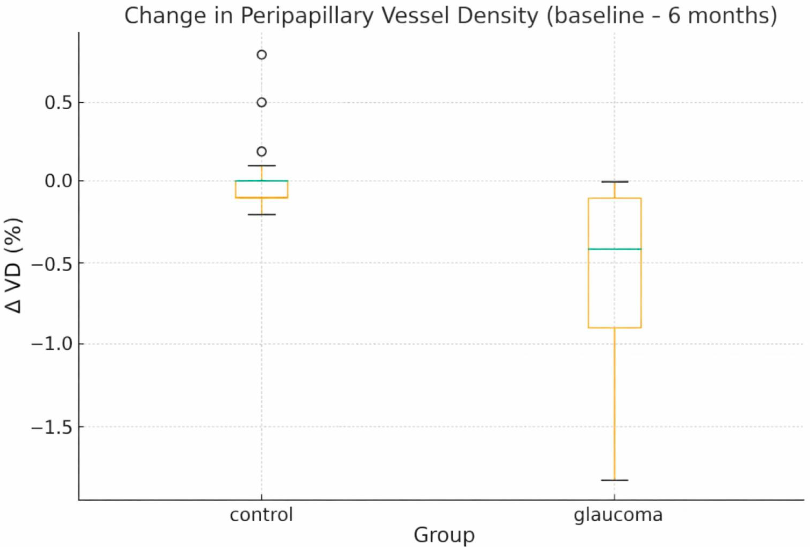 - PP-VD decreased by 0.57% in glaucoma eyes, whereas controls remained essentially stable (Δ = +0.02%). The between-group Δ difference was −0.59% (95% CI, −0.81 to −0.37; d = 1.41), and individual values are depicted in Figure 2.