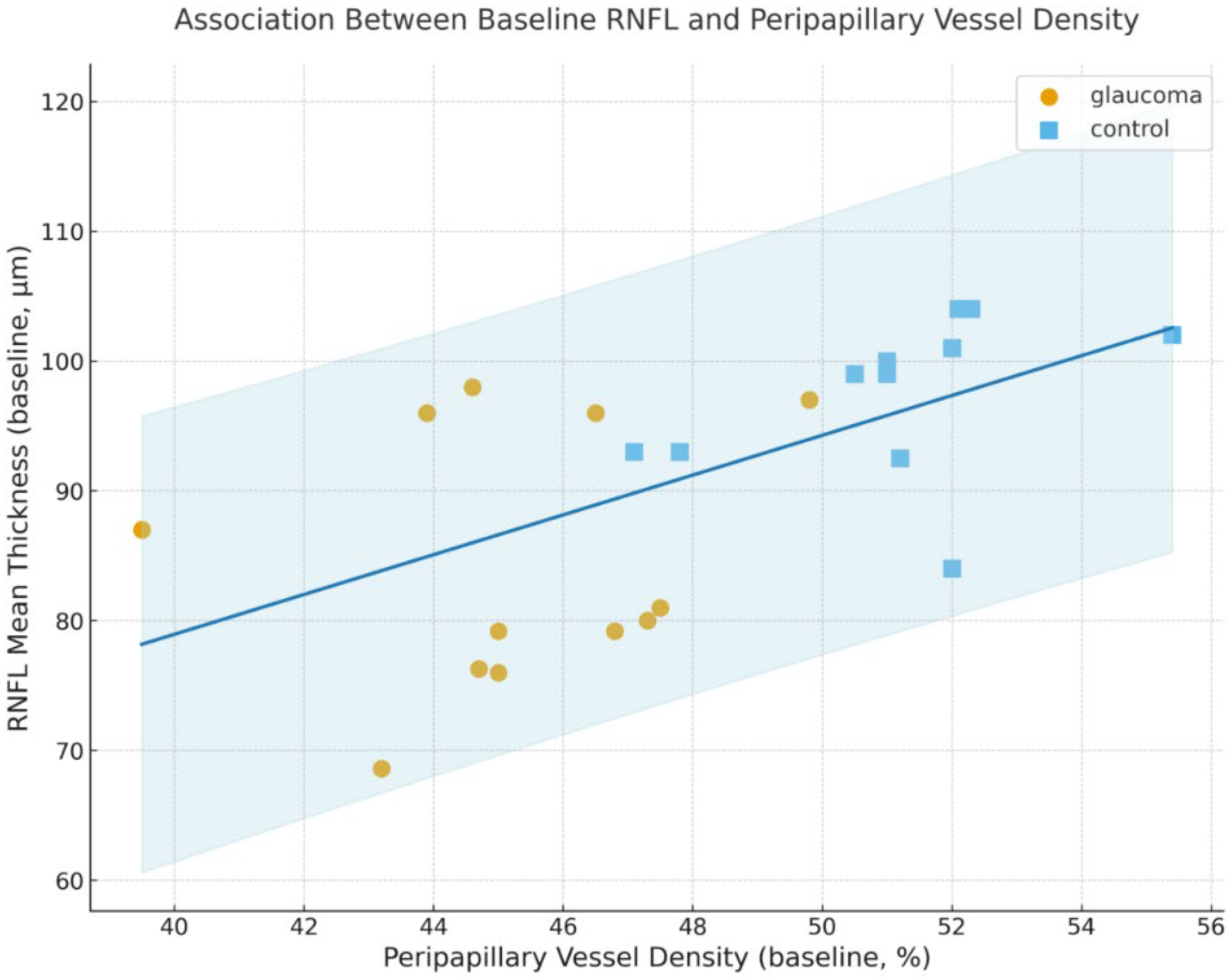 - RNFL thickness decreased by 1.04 µm in glaucoma eyes versus 0.22 µm in controls (between-group Δ difference: −0.82 µm; 95% CI, −1.28 to −0.36; d = 0.94).