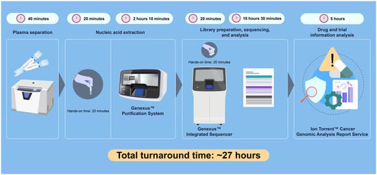 - Low, S.K.; Ariyasu, R.; Uchibori, K.; Hayashi, R.; Chan, H.T.; Chin, Y.M.; Akita, T.; Harutani, Y.; Kiritani, A.; Tsugitomi, R.; et al. Rapid genomic profiling of circulating tumor DNA in non-small cell lung cancer using oncomine precision assay with GenexusTM integrated sequencer. Transl. Lung Cancer Res. 2022, 11, 711–721. [Google Scholar] [CrossRef]