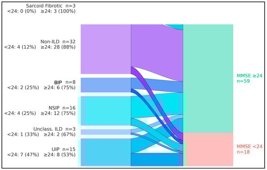 The flows showed that, overall, 18/77 participants (23.4%) had MMSE < 24 and 59/77 (76.6%) had MMSE ≥ 24. By diagnostic group, cognitive impairment (MMSE < 24) occurred in 7/15 with UIP (46.7%), 4/16 with NSIP (25.0%), 2/8 with BIP pattern (25.0%), 1/3 with unclassifiable/combined pattern ILD (33.3%), 0/3 with sarcoidosis-associated pulmonary fibrosis (0%), and 4/32 among non-ILD comparators (12.5%). Consequently, UIP contributed the largest share of impaired cases (7/18, 38.9%), whereas non-ILD participants predominantly exhibited preserved cognition (28/32, 87.5%). The aggregate streams converged to a larger node for MMSE ≥ 24 (n = 59) and a smaller node for MMSE < 24 (n = 18), indicating that most groups retained normal cognition while impairment clustered in fibrotic ILD—particularly UIP (