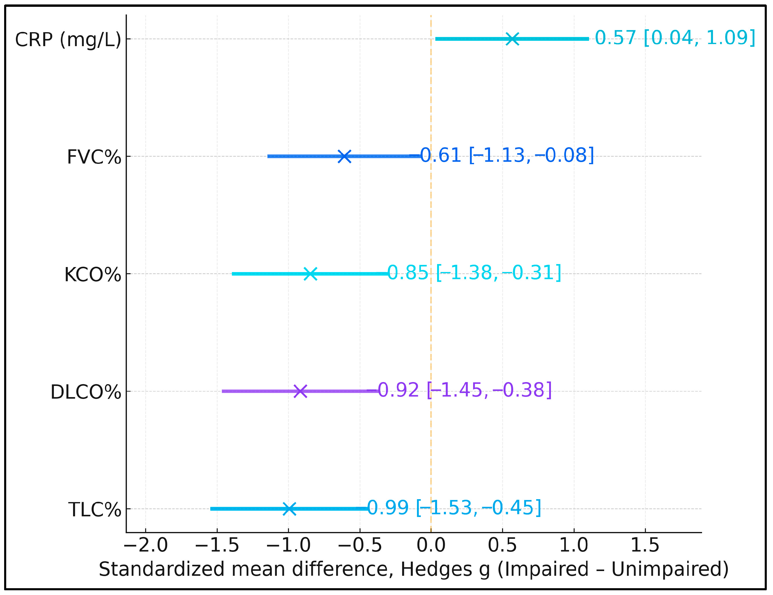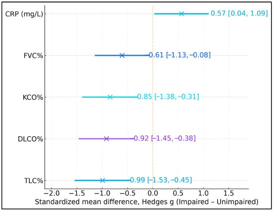 Standardized mean differences (Hedges g; impaired minus unimpaired) indicated that the cognitively impaired group had markedly lower lung volumes and gas-transfer capacity, alongside somewhat higher systemic inflammation. Effect sizes for TLC%, DLCO%, KCO%, and FVC% ranged from −0.61 to −0.99, corresponding to moderate-to-large deficits in pulmonary function among participants with MMSE < 24 (
