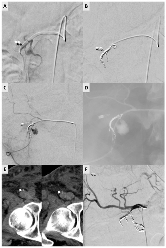 A 60-year-old male undergoing endoscopic ultrasound-guided fine needle aspiration (EUS-FNA) for a pancreatic mass, complicated by duodenal hemorrhage, requiring angiographic intervention. (A) Initial angiogram revealing a pseudoaneurysm of the posterior superior pancreaticoduodenal artery (PSPDA). (B) Successful coil embolization of the gastroduodenal artery (GDA) and PSPDA was performed with favorable angiographic outcome. Hemostasis was achieved with 6F AngioSeal. (C) Recurrent symptoms 4 days after index procedure prompted a repeat angiogram confirming recanalization of the pseudoaneurysm. (D) Subsequent embolization of the pseudoaneurysm using glue was performed. Hemostasis again achieved with 6F AngioSeal. (E) Symptoms recurred 3 days later, and a follow-up CTconfirmed re-bleeding. Unenhanced CT of the right common femoral artery (CFA) showing two closely positioned AngioSeal devices (white arrowheads) seen as small high-density structures within or adjacent to the previous puncture. (F) Re-repeat definitive embolization of GDA branches with coils to address persistent bleeding was performed and patient’s bleeding symptoms resolved. Hemostasis was again achieved with 6F AngioSeal, the 3rd deployment in the same vessel in 8 days.