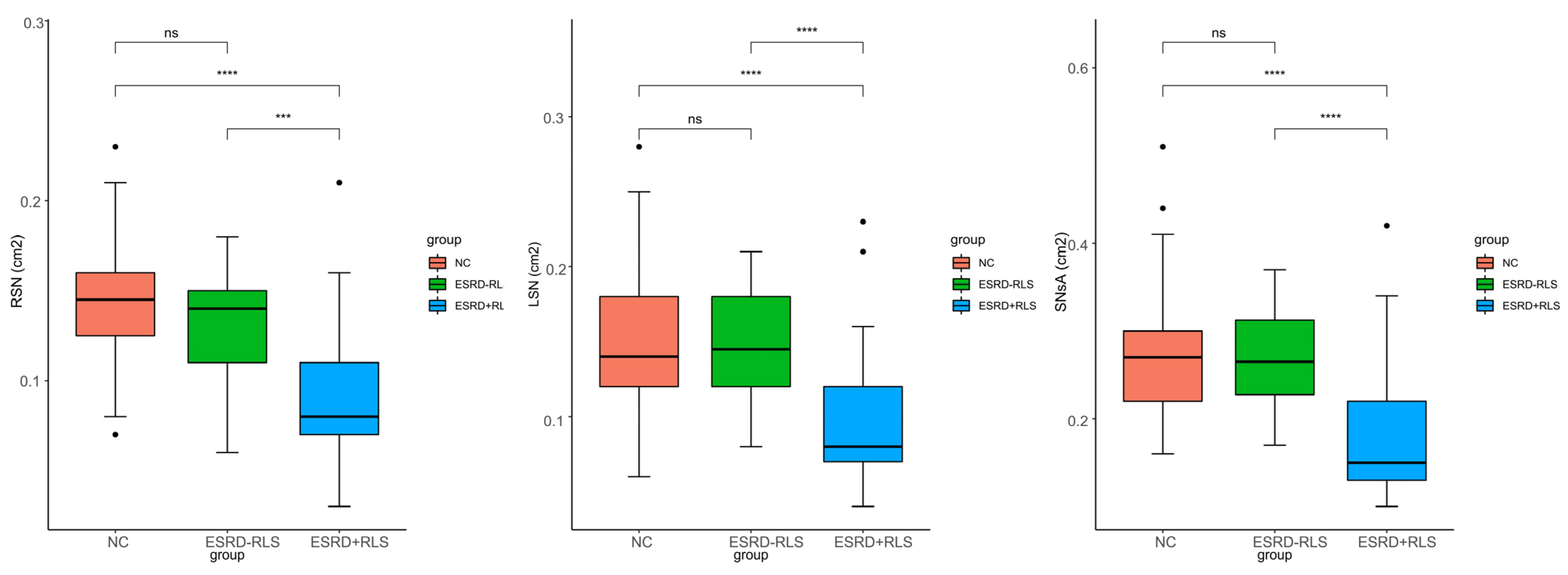 Figure 1). Post hoc analysis showed that RSN, LSN, and SNsA were significantly smaller in the ESRD + RLS group than in the ESRD − RLS and normal control groups (all