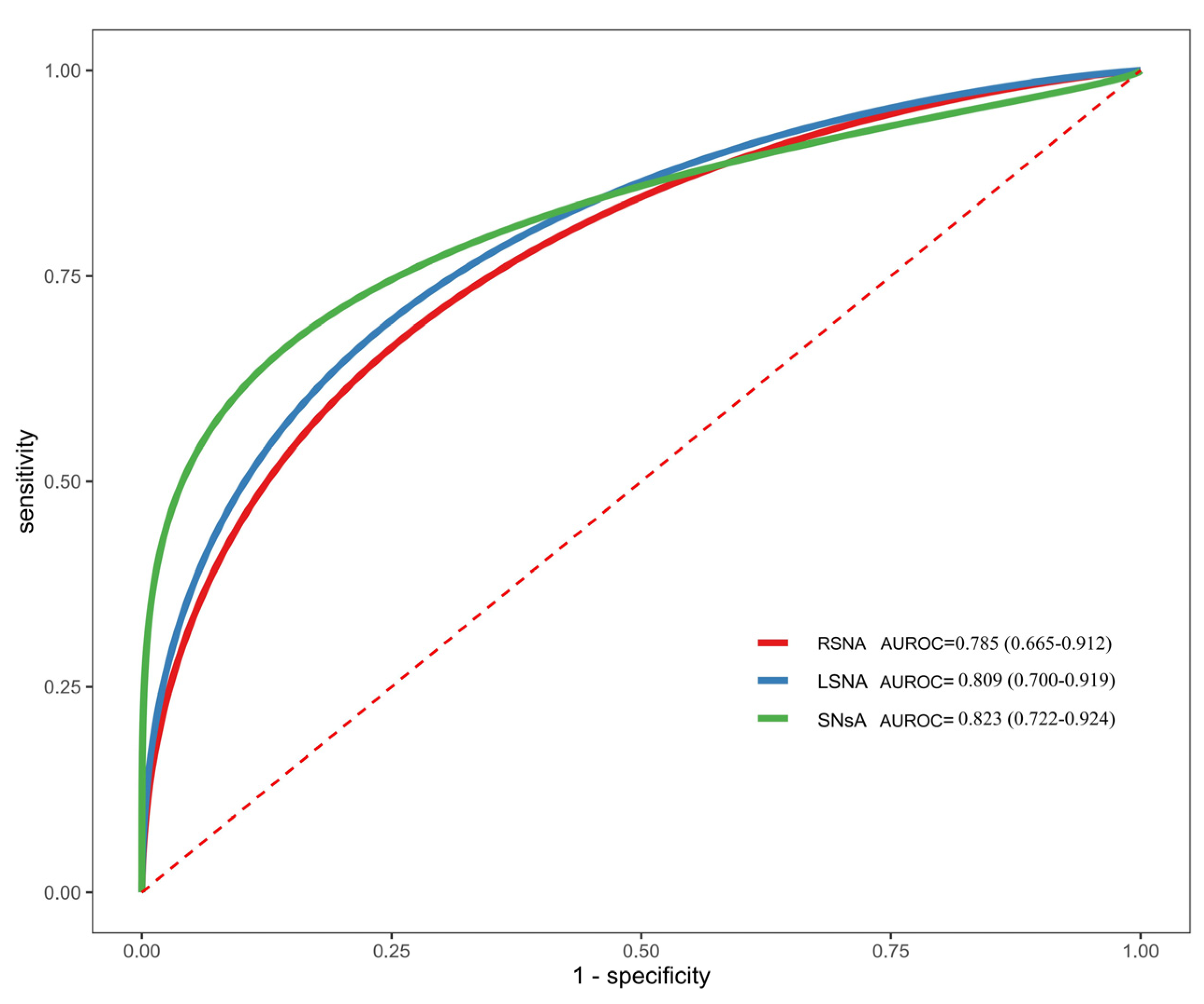 Figure 3). SNsA exhibited the highest diagnostic value, with an AUROC of 0.823 (95% CI: 0.722–0.924). At a cutoff of 0.22 cm