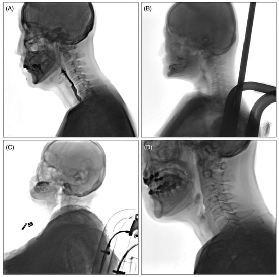 Example of classification according to VFSS video quality. (A): Q1; videos in which the airway and epiglottis are clearly visible without artifacts, (B): Q2; videos in which the epiglottis is clearly visible but the airway is partially obscured due to the shoulders, (C): Q3; videos with severe bolus transit issues during the oral phase, making it difficult to adequately assess the pharyngeal phase, (D): Q4; videos with multiple artifacts caused by buttons, previous surgeries, thyroid calcification, constant moving of the patients’ head, etc.