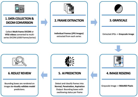 Each video is broken down into individual frames and converted into a sequential image dataset, which is then used for downstream processing and AI-based prediction. The system is implemented using Python’s Flask micro web framework (version 3.10), providing a lightweight yet scalable architecture. Additionally, it integrates an interactive image-labeling tool that allows clinical experts to annotate swallowing events, as well as a clinical data management module for storing and retrieving patient-specific information. Uploaded videos are stored in a database, and object detection is performed for patient condition assessment by the AI model immediately upon upload. The image analysis process for multi-frame DICOM files or video files captured during VFSS is shown in Figure 3.