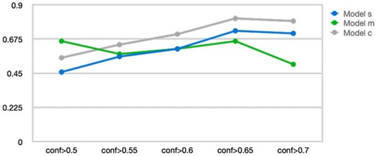 We compared and optimized the performance of three YOLOv9 variants (Model s, Model m, and Model c) by adjusting the hyperparameters and structural parameters. During the performance validation process, we fine-tuned the model’s confidence threshold and ultimately applied a confidence of 0.65. Confidence refers to the criterion for judging a video as no airway invasion if the prediction score of the object detection model is below the threshold. The performance comparison according to the confidence threshold for each YOLOv9 variant model is presented in Figure 5.