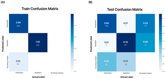 Analysis of the confusion matrix for the training dataset and test dataset. The numbers in each matrix indicate accuracy (large font) and the number of images used (small font). According to the internal validation of the developed AI model, aspiration showed an accuracy of 0.76, and penetration showed an accuracy of 0.66. (A) Training confusion matrix; (B) test confusion matrix.