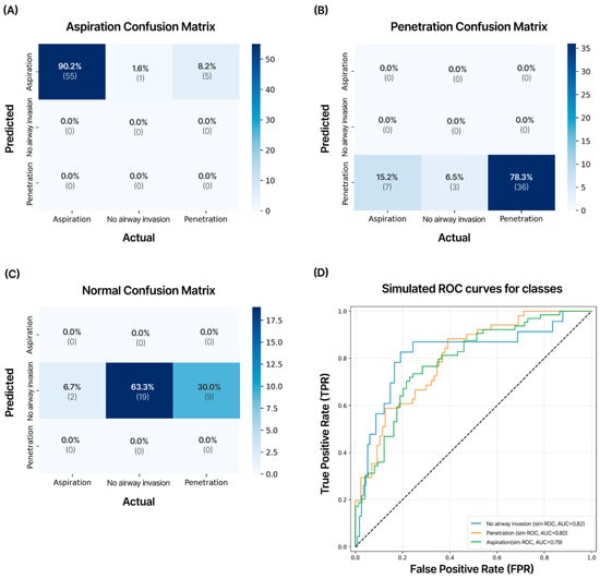 Confusion matrix of the test dataset for external validation. VFSS videos of 138 cases obtained from two other hospitals not included in the development of the AI model were validated. This model showed external validation accuracies of 90.2% for aspiration, 78.3% for penetration, and 63.3% for no airway invasion cases. The numbers in each matrix indicate precision (large font) and the number of cases (small font). (A) Aspiration; (B) penetration; (C) no airway invasion; (D) results of receiver operating characteristic (ROC) curves and area under the curve (AUC) values for external validation data on aspiration, penetration, and no airway invasion.