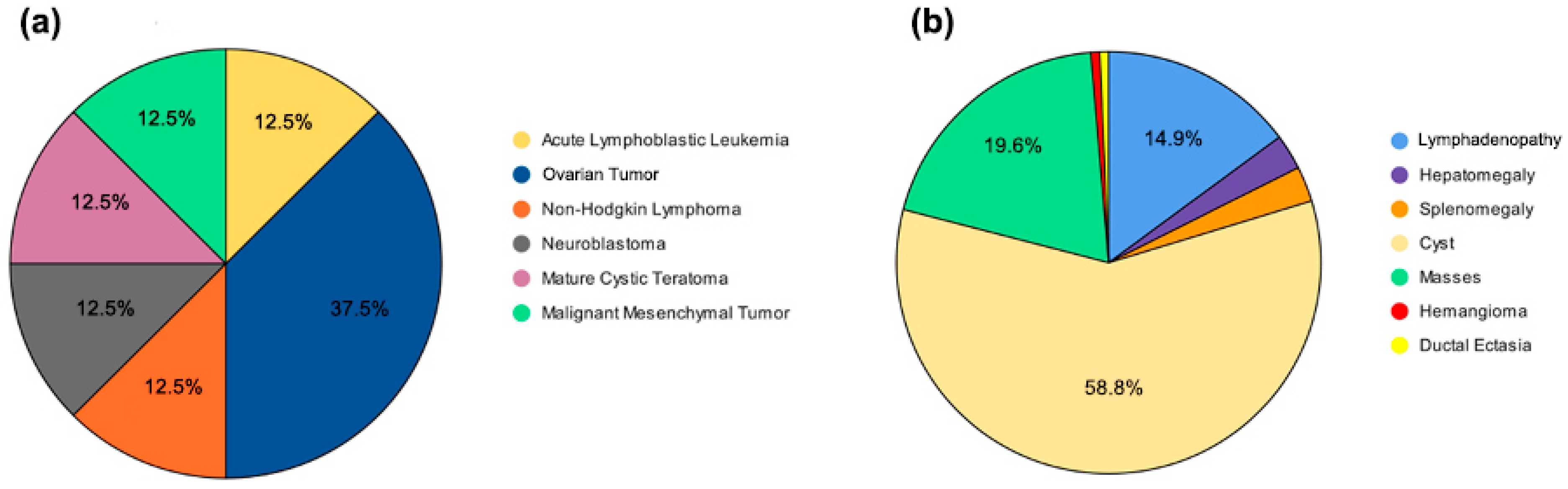 Figure 1a shows that the most frequent malignancy among patients with elevated CA-125 was ovarian tumors (37.5%), followed by acute lymphoblastic leukemia (12.5%), non-Hodgkin lymphoma (12.5%), neuroblastoma (12.5%), mature cystic teratoma (12.5%), and malignant mesenchymal tumor (12.5%).