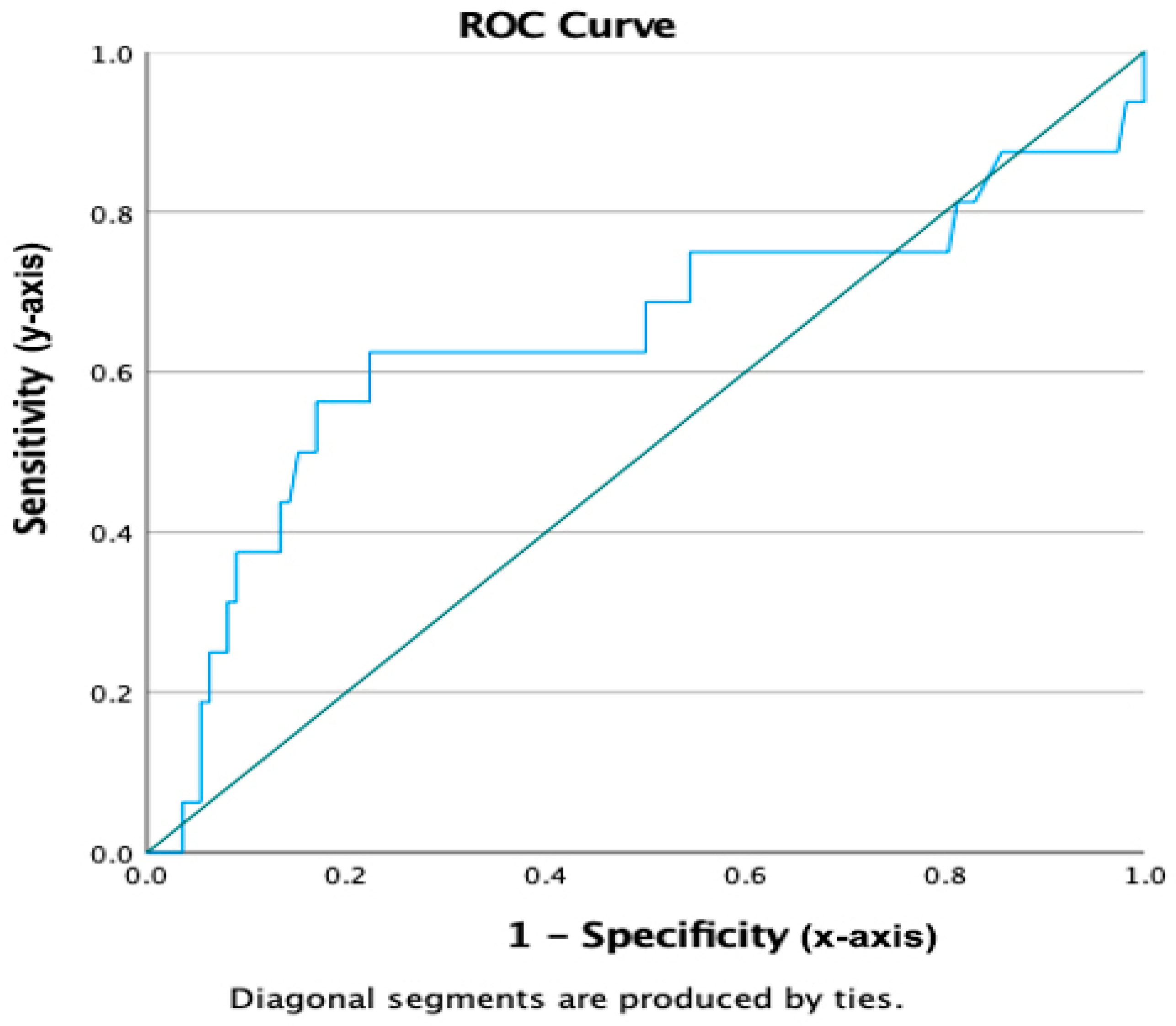 The sensitivity, specificity, PPV, and NPV of CA-125 for detecting malignancy were 22.9%, 85.2%, 29.6%, and 80.4%, respectively. The area under the ROC curve (AUC) was 0.642 (95% CI: 0.466–0.819, p = 0.066), indicating limited discriminative ability.
