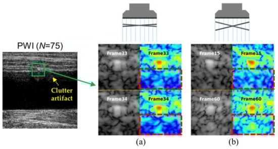 ) and the corresponding SPWI images for selected frames of the PWI data obtained from a tissue-mimicking clutter phantom. As illustrated in Figure 1, the PWI image still exhibited strong reverberation artifacts despite employing numerous PWs. In addition, clutter artifacts arising from the same scatterer maintain high spatial correlation between adjacent PW frames (e.g., 33rd and 34th out of 75), whereas the correlation diminishes as the frame interval increases (e.g., 15th and 60th out of 75), as shown in Figure 1a,b. This observation forms the basis of our approach: tissue signals maintain spatial coherence across all steering angles because of their consistent anatomical origin, whereas clutter artifacts exhibit decorrelation governed by the steering angle and acoustic wavelength.