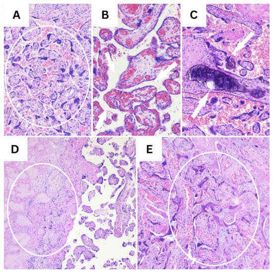 Representative H&E findings in placental tissue (10×). (A) Marked syncytial knotting, indicative of accelerated villous maturation (circle). (B) Chorangiosis, defined by an increased number of capillaries within terminal villi (white arrows). (C) Intravillous calcifications (white arrows). (D) Extensive placental infarction showing villous necrosis and the loss of normal architecture (circle). (E) Early placental infarction with villous ischemic changes and stromal collapse (circle).