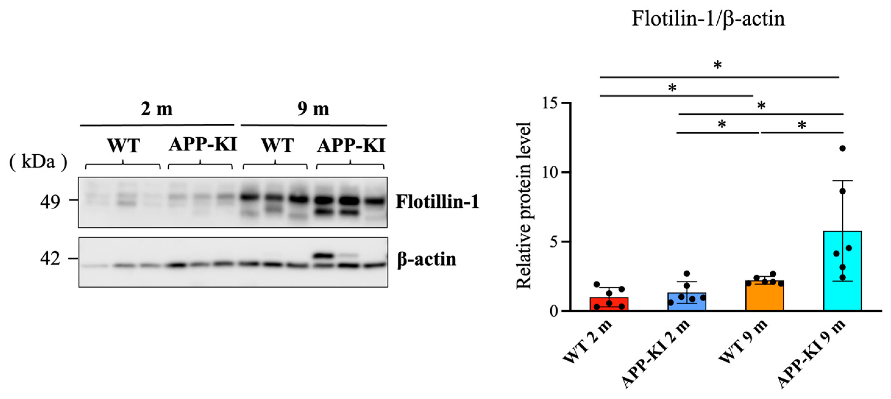 Salivary gland flotillin-1 levels were also significantly higher in the 9-month-old APP-KI group than in the 2-month-old APP-KI and WT groups, as well as the 9-month-old WT group. Moreover, the 9-month-old WT group showed significantly higher levels than the 2-month-old WT group (