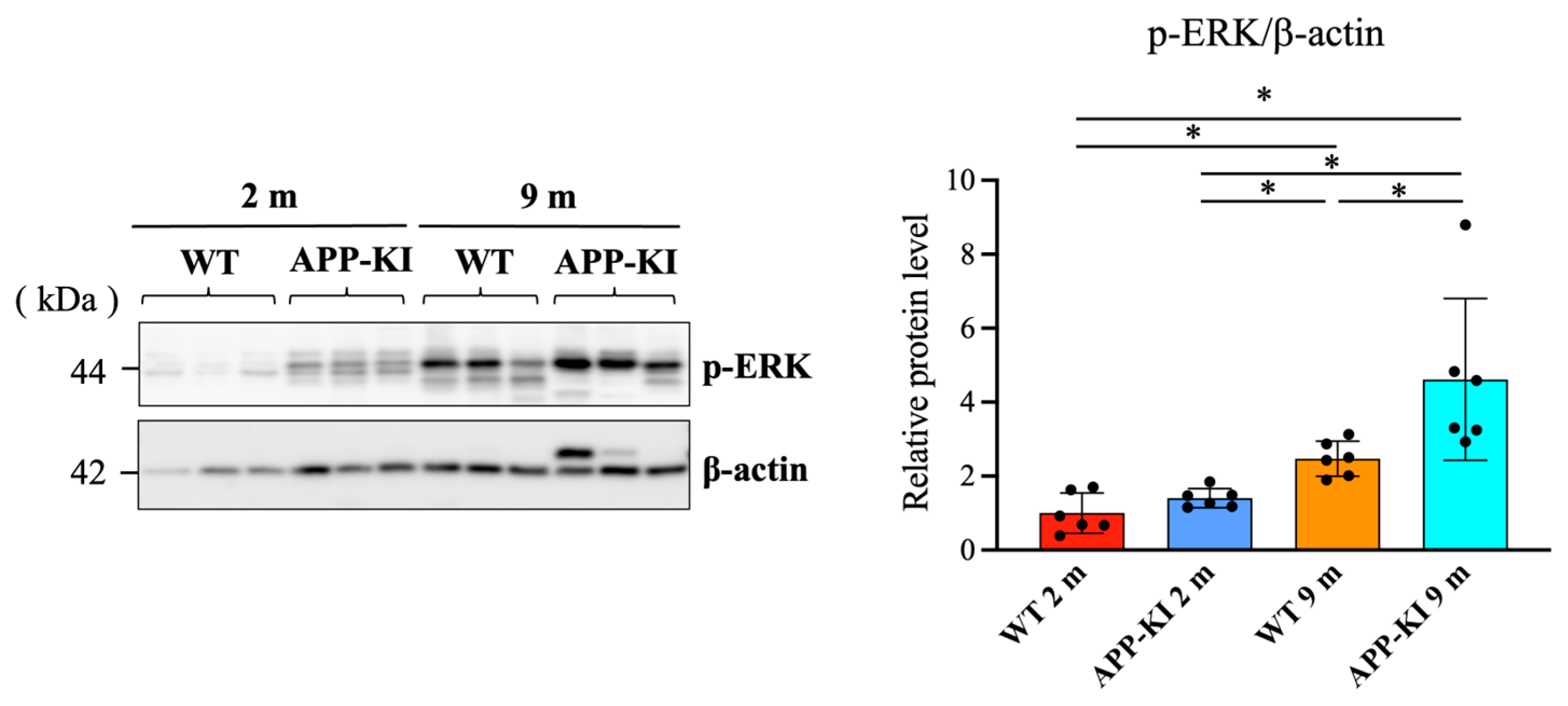 19]. In the present study, p-JNK and p-ERK levels were significantly higher in 9-month-old WT mice than in 2-month-old WT mice, and in 9-month-old APP-KI mice than in 2-month-old APP-KI mice, suggesting that aging activates JNK and ERK. Similar age-related activation of ERK has been reported in vascular endothelial cells and cardiomyocytes, where ERK activation is enhanced by oxidative stress responses and inflammation-associated signaling [