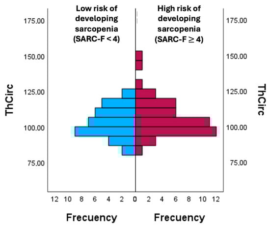 In Figure 2, thigh circumference (ThCirc) was compared between participants with the risk of patients developing sarcopenia according to the SARC-F. The group with a score ≥ 4 points on the SARC-F showed a higher mean ThCirc (106.89 ± 13.63) compared to the group with a score < 4 points on the SARC-F (103.06 ± 8.75), reflecting greater ThCirc values among individuals at the higher risk of developing sarcopenia according to the SARC-F.