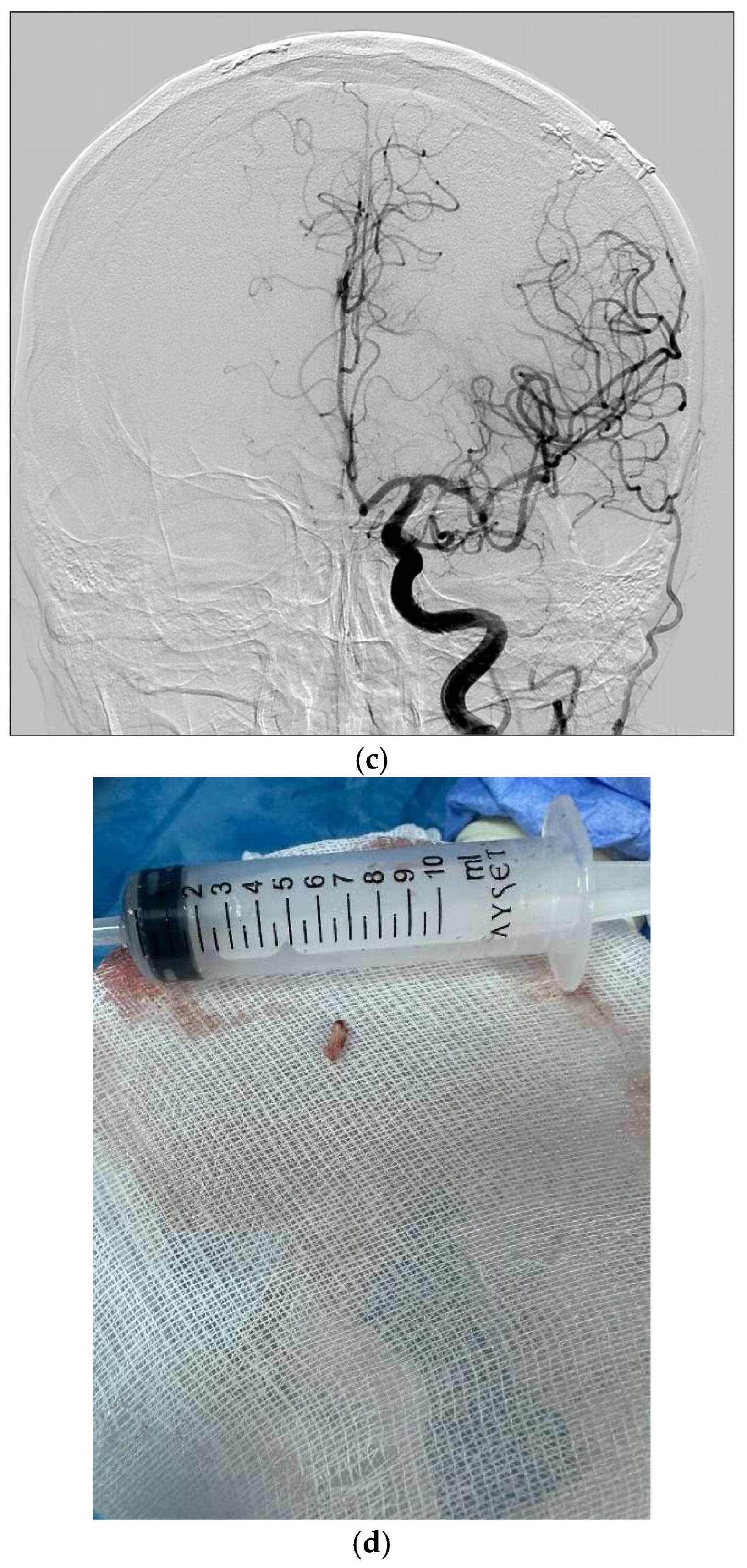 - Manisha, K.Y.; Poyuran, R.; Narasimhaiah, D.; Kumar Paramasivan, N.; Ramachandran, H.; Erat Sreedharan, S.; Er, J.; Kumar, S.; Thulaseedharan, J.V.; Sylaja, P. Thrombus histology does not predict stroke etiological subtype but influences recanalization. J Clin Neurosci. 2024, 124, 54–59. [Google Scholar] [CrossRef]