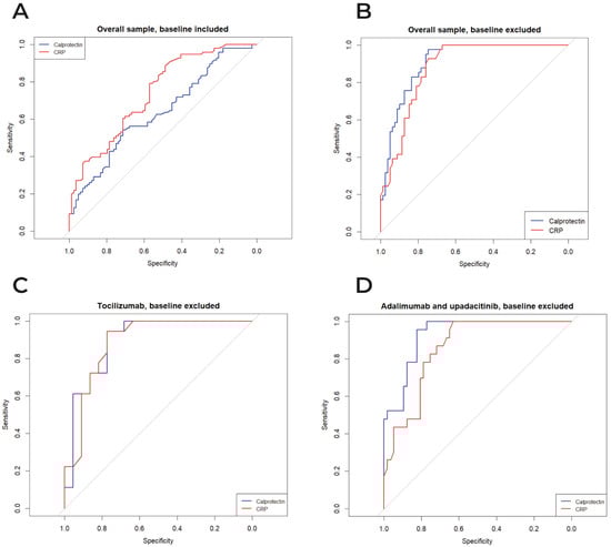In the full dataset including baseline observations, the discriminative performance of calprotectin and CRP for identifying patients in CDAI remission was modest, with AUCs of 0.636 and 0.739, respectively (p = 0.044; Figure 2A). When the analysis was restricted to follow-up data only (baseline excluded), calprotectin showed an AUC of 0.911, and CRP an AUC of 0.880, with no statistically significant difference between them (p = 0.302; Figure 2B). In the subgroup of patients treated with tocilizumab (baseline excluded), calprotectin and CRP performed similarly, with AUCs of 0.894 and 0.885, respectively (p = 0.888; Figure 2C). Conversely, in patients treated with adalimumab or upadacitinib (baseline excluded), calprotectin demonstrated significantly better discrimination than CRP, with AUCs of 0.929 and 0.857, respectively (p = 0.049; Figure 2D).