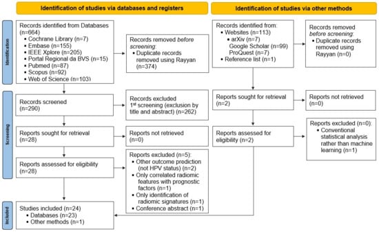 PRISMA Flowchart. This diagram illustrates the identification, screening, eligibility assessment, and inclusion of studies evaluating radiomics and machine learning approaches for HPV status prediction. A total of 24 studies were included in the final qualitative synthesis. BVS: Biblioteca Virtual em Saúde; IIEE: Instituto dos Engenheiros Eletrônicos e Eletricistas.