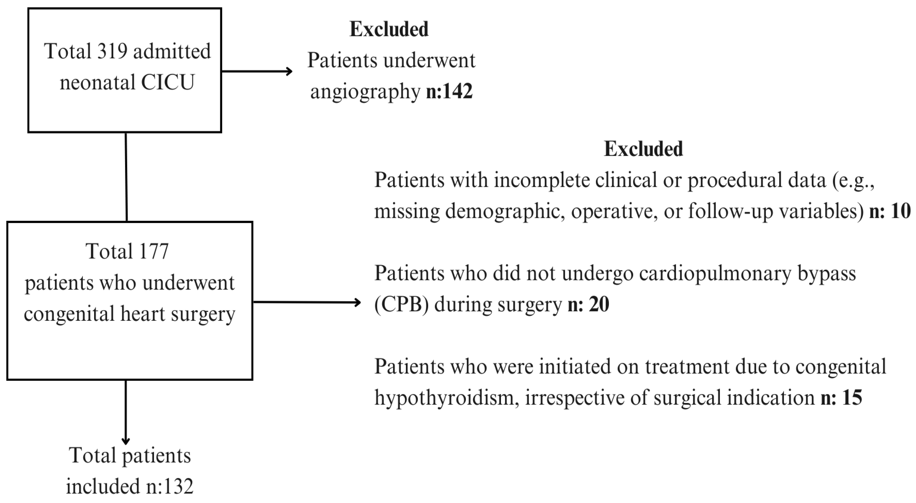 Based on this identified knowledge gap, we hypothesized that perioperative, particularly early postoperative, reductions in T3 and T4 levels in neonates undergoing cardiopulmonary bypass are associated with adverse short-term outcomes, including increased mortality. Accordingly, the primary aim of this study was to investigate the relationship between preoperative and early postoperative thyroid hormone levels (T3, T4, and TSH) and postoperative clinical outcomes in neonates undergoing congenital heart surgery with CPB.