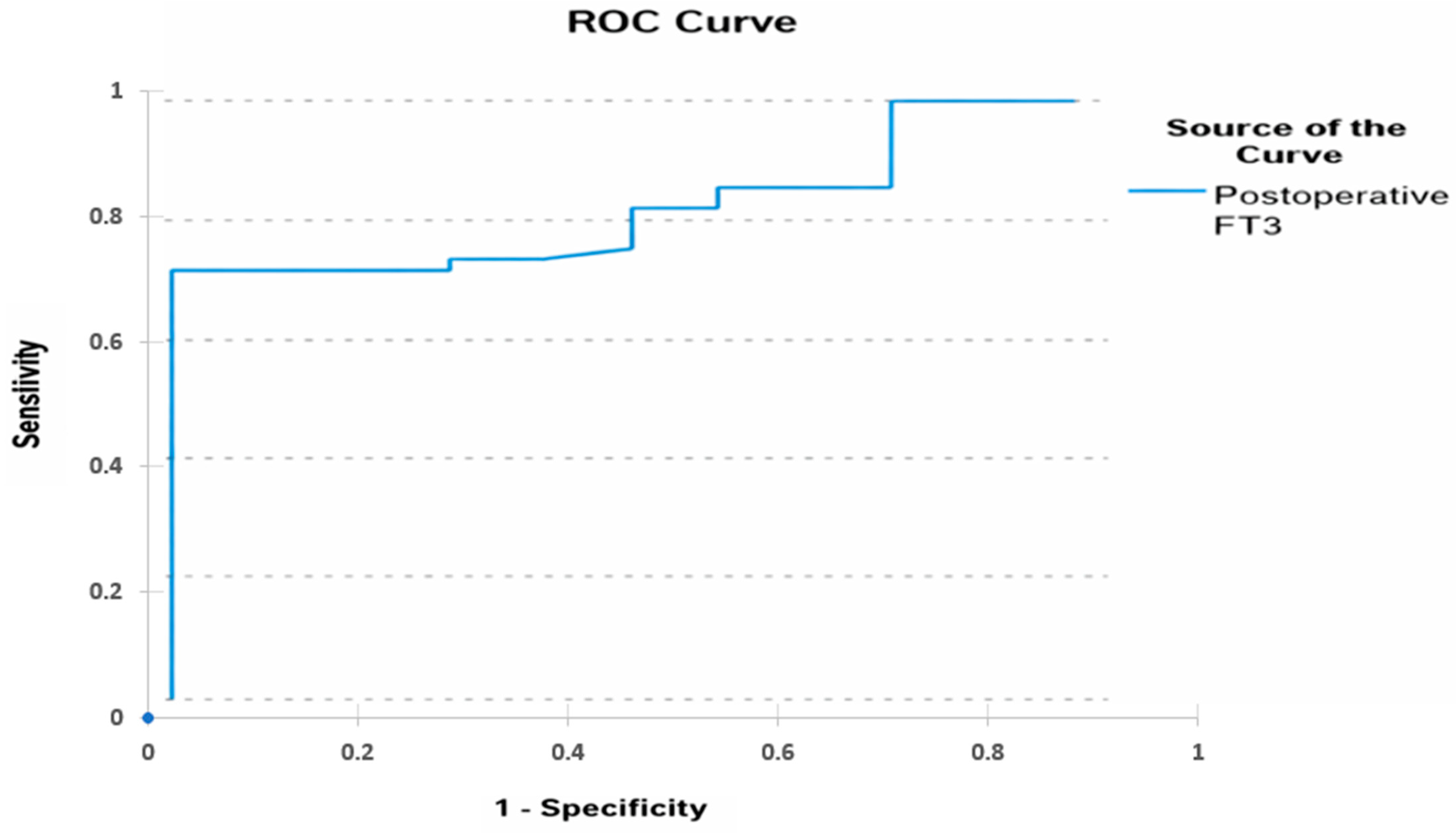 5]. In our study, the AUC for postoperative FT3 was 0.818. The identified cutoff value showed moderate sensitivity (72%) and specificity (70%). Together, these results reinforce FT3 as a strong discriminative biomarker.