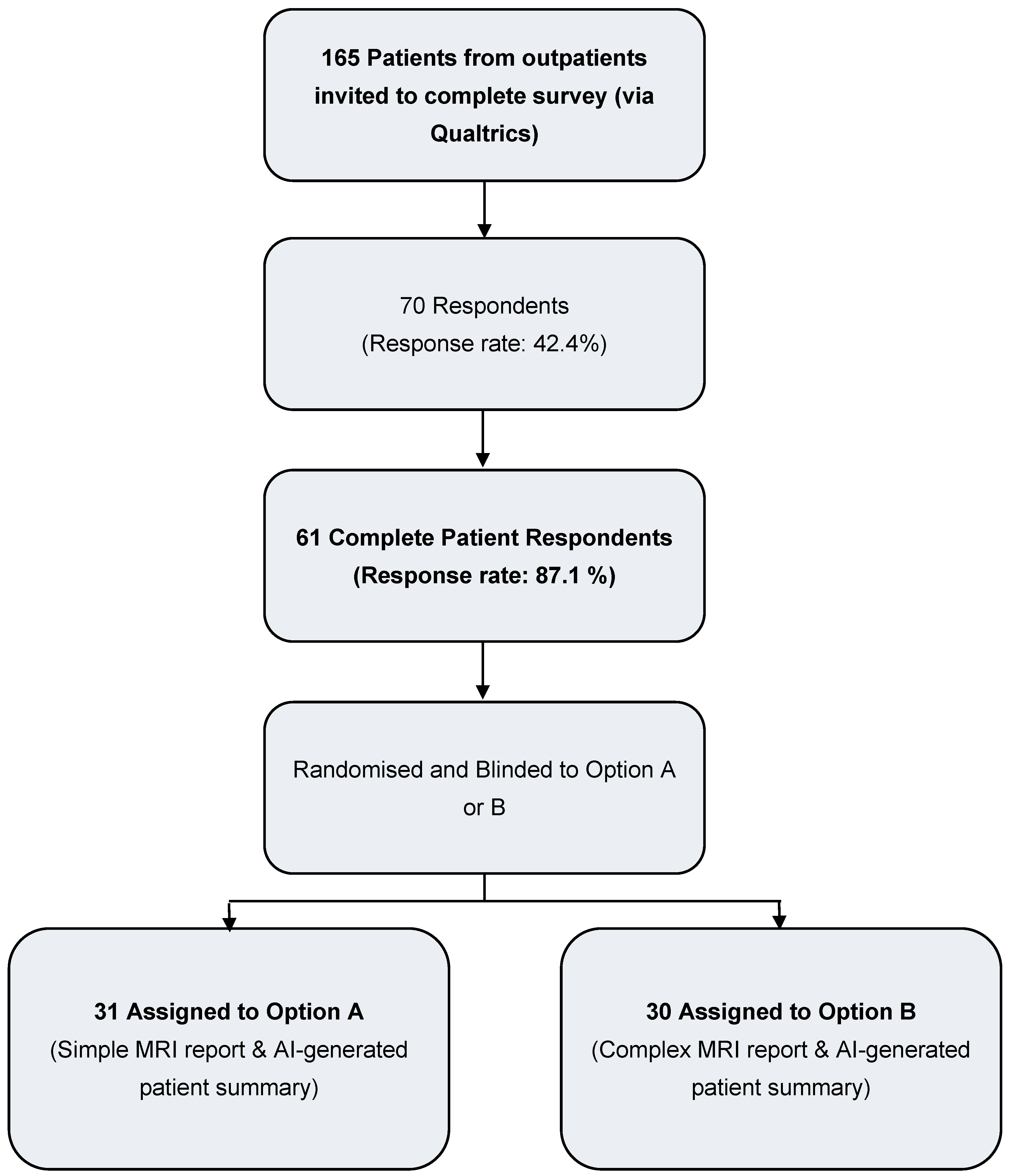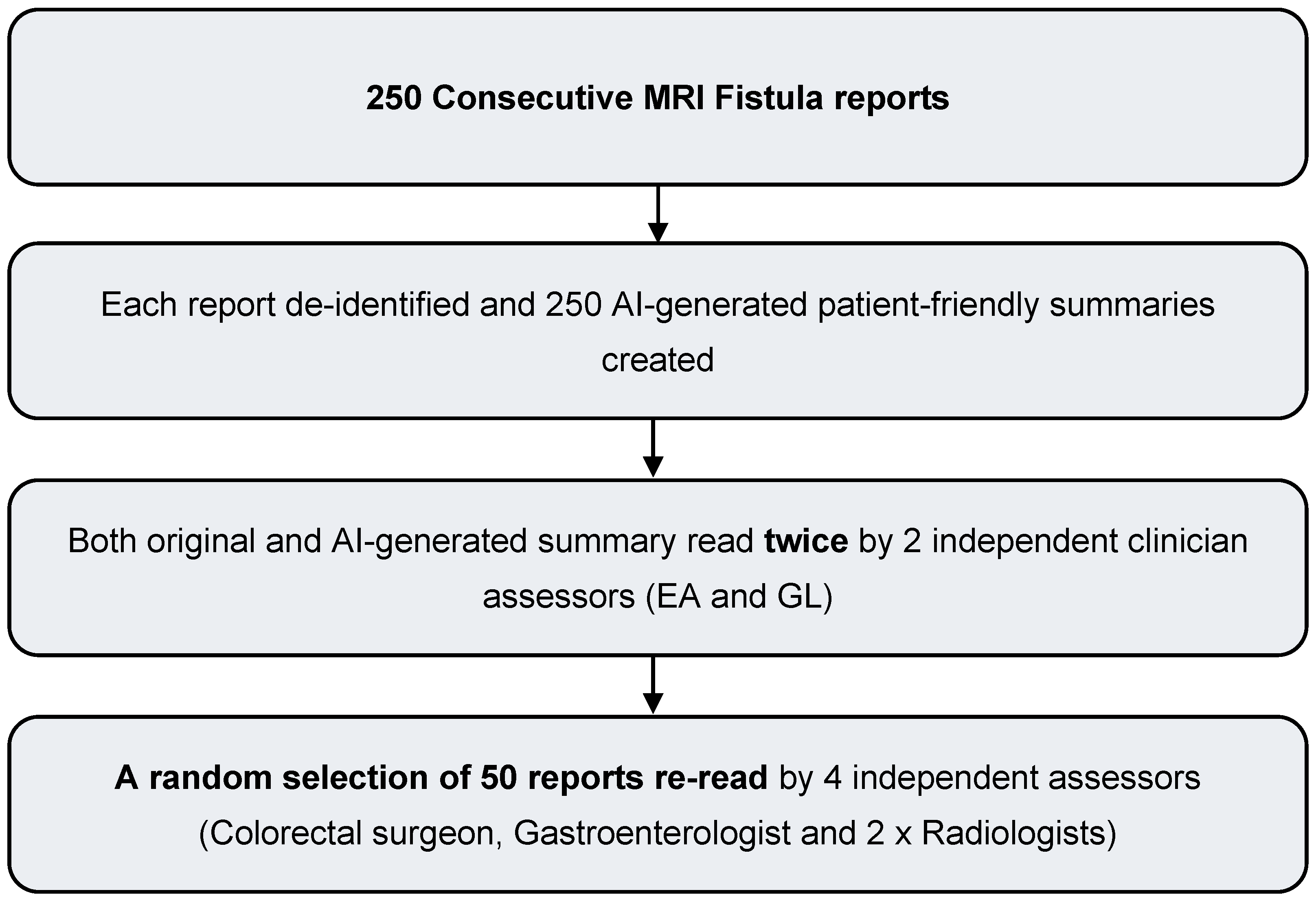 - Patient evaluation: Randomised patient study assessing readability, comprehensibility, perceived utility, trustworthiness and follow-up questions.