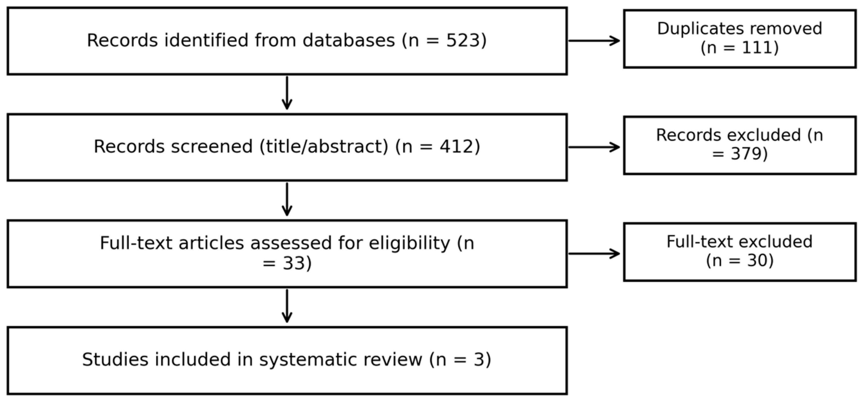 Two reviewers independently screened titles/abstracts and then full texts. Discrepancies were resolved by discussion and, if needed, senior adjudication. Full-text exclusion reasons were recorded.