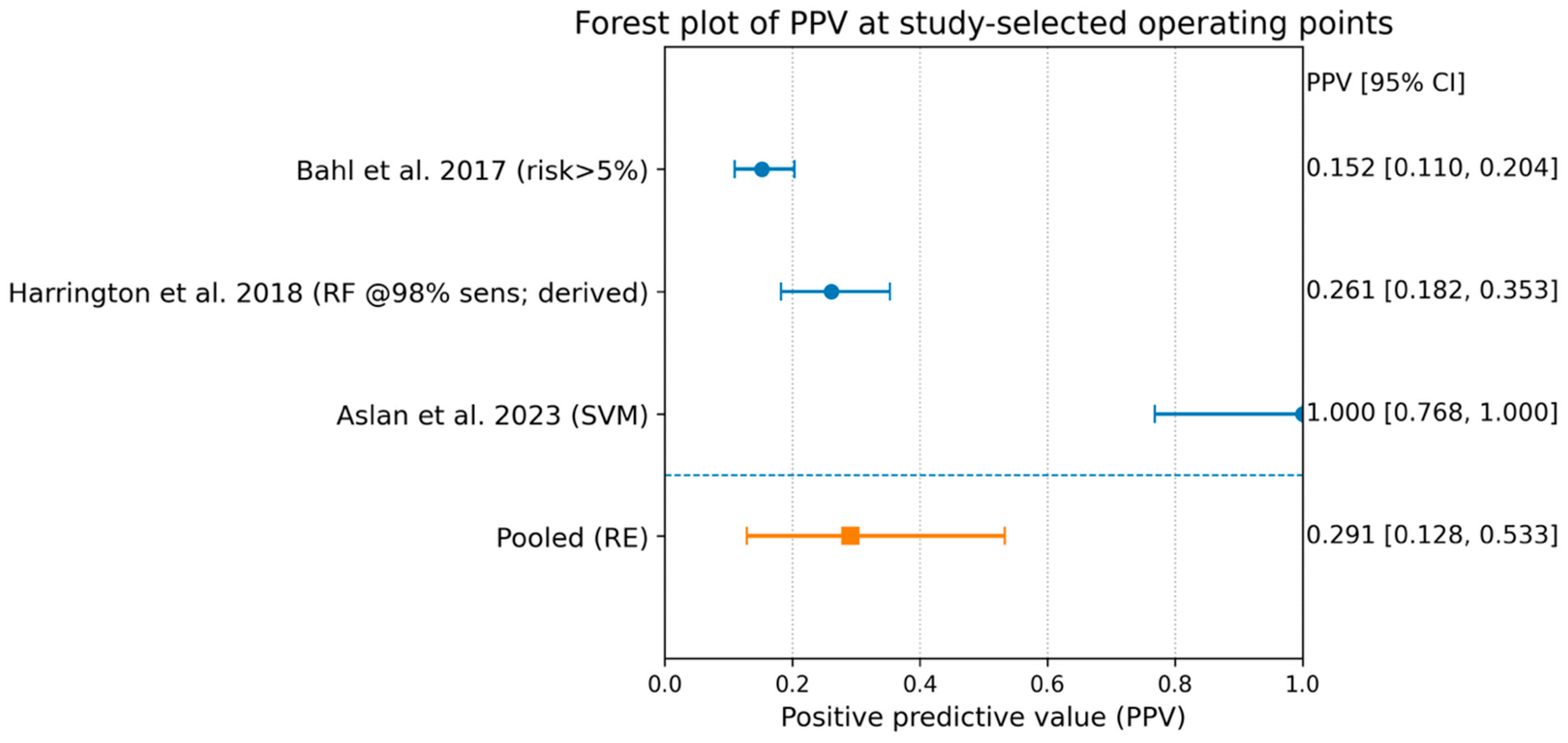 Pooling the three studies yielded a pooled PPV of 0.291 (95% CI 0.128–0.533) with substantial heterogeneity (I2 88%). This heterogeneity is to be expected because PPV is strongly influenced by (i) upgrade prevalence and (ii) the aggressiveness of the operating threshold.