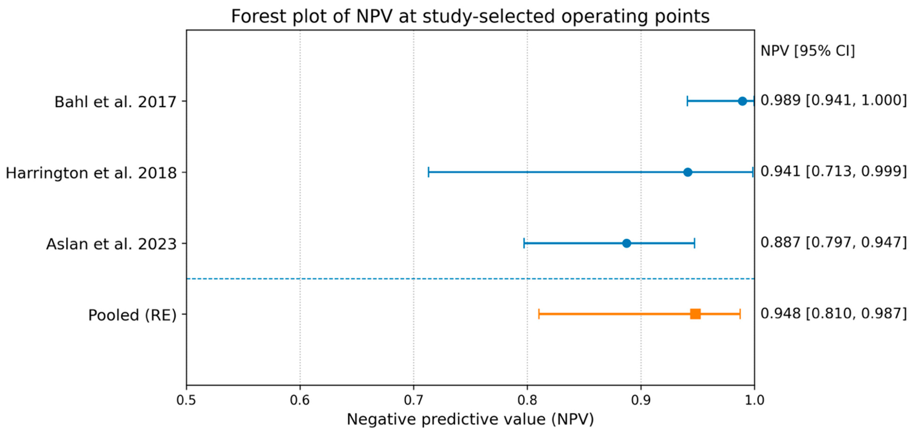 Pooling the three studies yielded a pooled NPV of 0.948 (95% CI 0.810–0.987) with moderate heterogeneity (I2 63%). Excluding Aslan increased the pooled NPV to 0.975 (95% CI 0.876–0.995), which is consistent with the higher-sensitivity operating points used in the remaining studies (Figure 3).