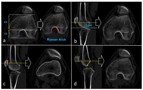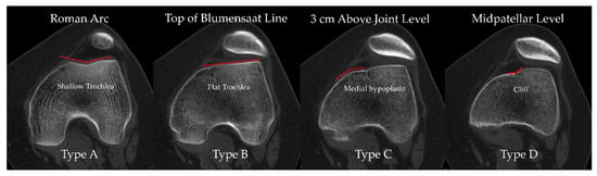 - Malghem, J.; Maldague, B. Depth insufficiency of the proximal trochlear groove on lateral radiographs of the knee: Relation to patellar dislocation. Radiology 1989, 170, 507–510. [Google Scholar] [CrossRef]