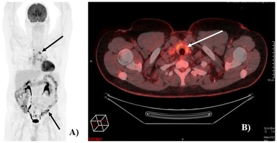 Image of [18F]FDG-PET/CT-detected immune-related adverse events (irAEs). (A) Example of a patient with [18F]FDG-PET/CT-detected irAEs in the colon and in mediastinal lymph nodes (black arrows). (B) Example of a patient with [18F]FDG-PET/CT detected irAE in the thyroid (white arrow).