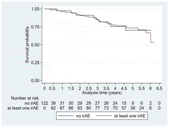 The multivariate OS analysis of irAEs (Table 3, Model 1) revealed no difference between those who had irAEs on [18F]FDG-PET/CT and those who did not. This was the case when looking purely at the presence of irAEs (HR: 0.74, CI: 0.12–4.45, p = 0.74) and when looking at irAEs as a time-varying variate (HR: 1.001, CI: 0.999–1.002, p = 0.54). Figure 2 shows a Kaplan–Meier plot for visual representation of the effect of irAEs on overall survival over time.