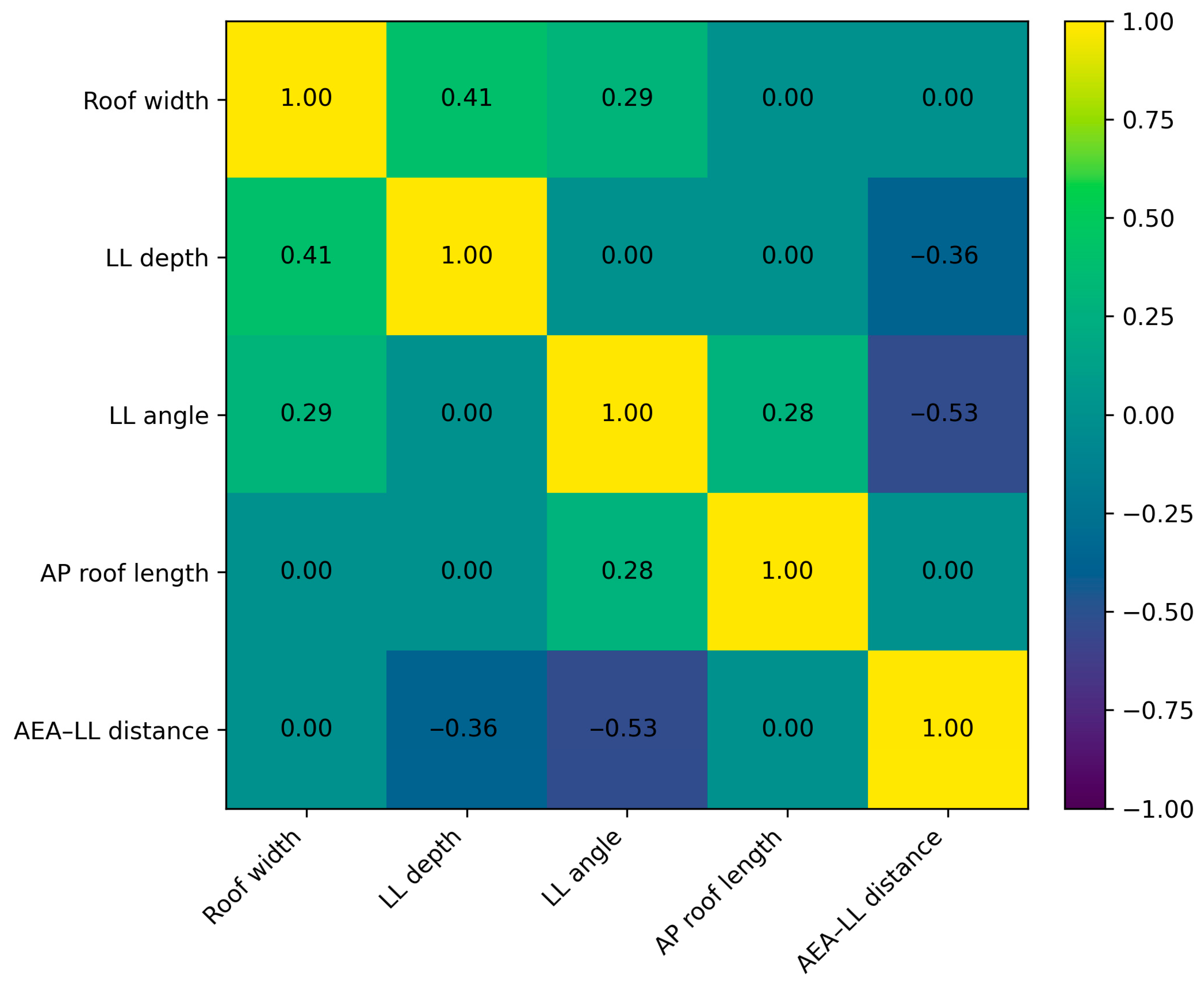 The heatmap illustrates Pearson correlation coefficients (r) among continuous morphometric variables, including ethmoid roof width, lateral lamella (LL) depth, LL angle, anterior–posterior (AP) roof length, and AEA–LL distance. Color intensity reflects the strength and direction of correlations. Abbreviations: AP, anterior–posterior; AEA, anterior ethmoidal artery; LL, lateral lamella.