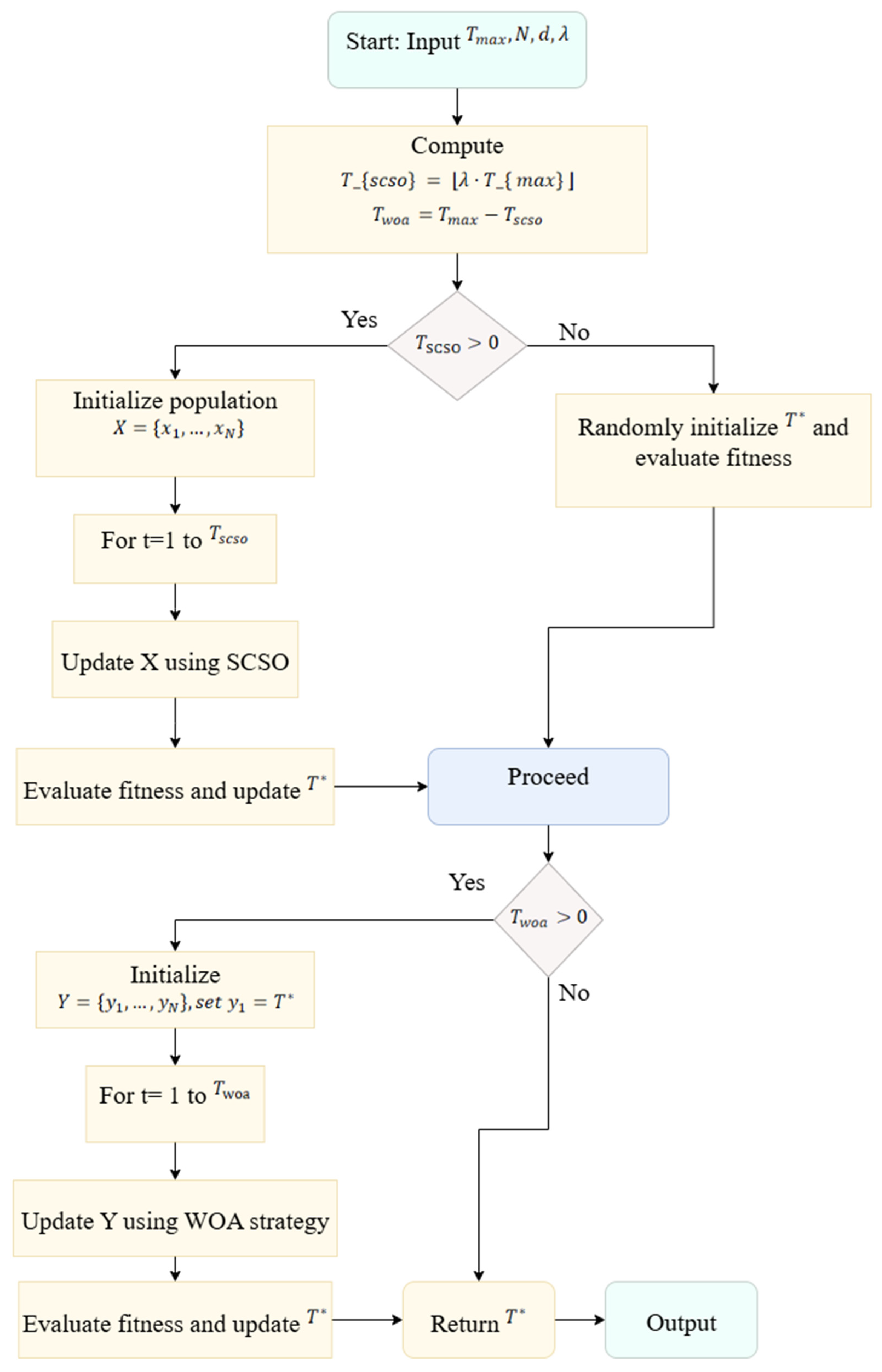 | Input: Total iterations Tmax, population size N, dimension d, switch ratio λ Output: Optimal solution T* 1. Set Tscso = ⌊λ × Tmax⌋ and Twoa = Tmax − Tscso 2. if Tscso > 0 then // SCSO Exploration Phase 3. Initialize population X = {x1, x2, …, xn} randomly in search space 4. for t = 1 to Tscso do 5. for each individual xi ∈ X do 6. Update xi using SCSO movement: xi(t + 1) = xi(t) + r1·(μ − xi(t)) + r2;·(x_best(t) − xi(t)) where r1, r2 ~ U(0, 1) and μ is mean position 7. end for 8. Evaluate fitness f(xi) for all xi 9. Update global best T* ← arg min f(xi) 10. end for 11. else 12. Randomly initialize best solution T* within bounds 13. Evaluate fitness f(T*) 14. end if 15. if Twoa > 0 then // WOA Exploitation Phase 16. Initialize population Y = {y1, y2, …, yn} randomly 17. Set y1 = T* // Carry over best from SCSO phase 18. for t = 1 to Twoa do 19. for each yi ∈ Y do 20. Compute A = 2a·r − a, C = 2r, where a = 2 − 2t/Twoa, r ~ U(0, 1) 21. if |A| < 1 then // Encircling prey (exploitation) 22. D = |C·T* − yi|, yi = T* − A·D 23. else // Search for prey (exploration) 24. Select random y_rand, D = |C·y_rand − yi| 25. yi = y_rand − A·D 26. end if 27. end for 28. Evaluate fitness f(yi) and update T* if better found 29. end for 30. end if 31. return T* |