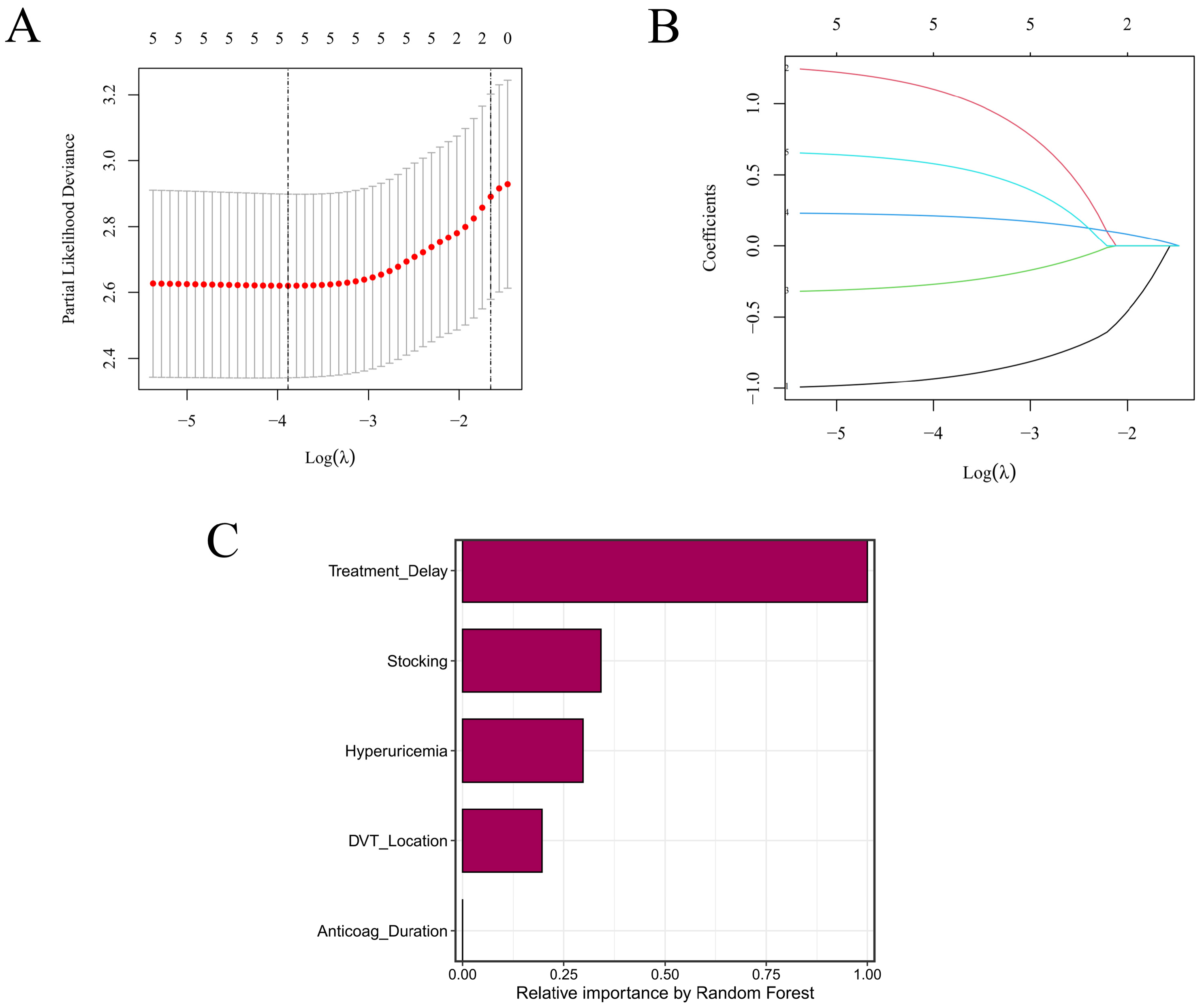 The primary endpoint was incident PTS, adjudicated by trained assessors utilizing the Villalta scale at 3, 6, 9, and 12 months; survival time was defined from the index date to the first occurrence of any form of PTS, with censoring at last contact or end of study. Candidate predictors were pre-specified and clinically motivated; demographics/comorbidities (age, sex, body mass index (BMI), hyperuricemia, and chronic kidney disease (CKD)), thrombus characteristics (notably iliac–femoral involvement), care-process/treatment variables (time-to-anticoagulation, as well as class and duration of anticoagulant use), compression-stocking use/adherence, various lifestyle factors (smoking and alcohol) and baseline laboratories made up the full set. Treatment delay (time to anticoagulant treatment) is defined as the time interval (in days) from the onset of symptoms reported by the patient to the initiation of therapeutic anticoagulant treatment, not the delay after imaging diagnosis. “Anticoagulant type” was defined as the anticoagulant class used at the index presentation (initial treatment phase), whereas the overall duration of anticoagulation was recorded separately as “Anticoag Duration”. Concomitant pulmonary embolism at the index presentation was not prespecified for systematic capture in the study case-report forms and was therefore not included in the current analyses; it was not an exclusion criterion. In the training set, we performed univariable followed by multivariable Cox regression to identify a parsimonious yet clinically plausible subset of predictors. Collinearity was screened, and all subsequent modeling based upon this was reconciled. The dataset was randomly partitioned 70/30 into training and independent test sets, stratified by both center and event type for reproducible analysis. Feature screening and all forms of hyperparameter tuning were kept within the training set; the true, final evaluation of the model was and remains to be held back on the test set.