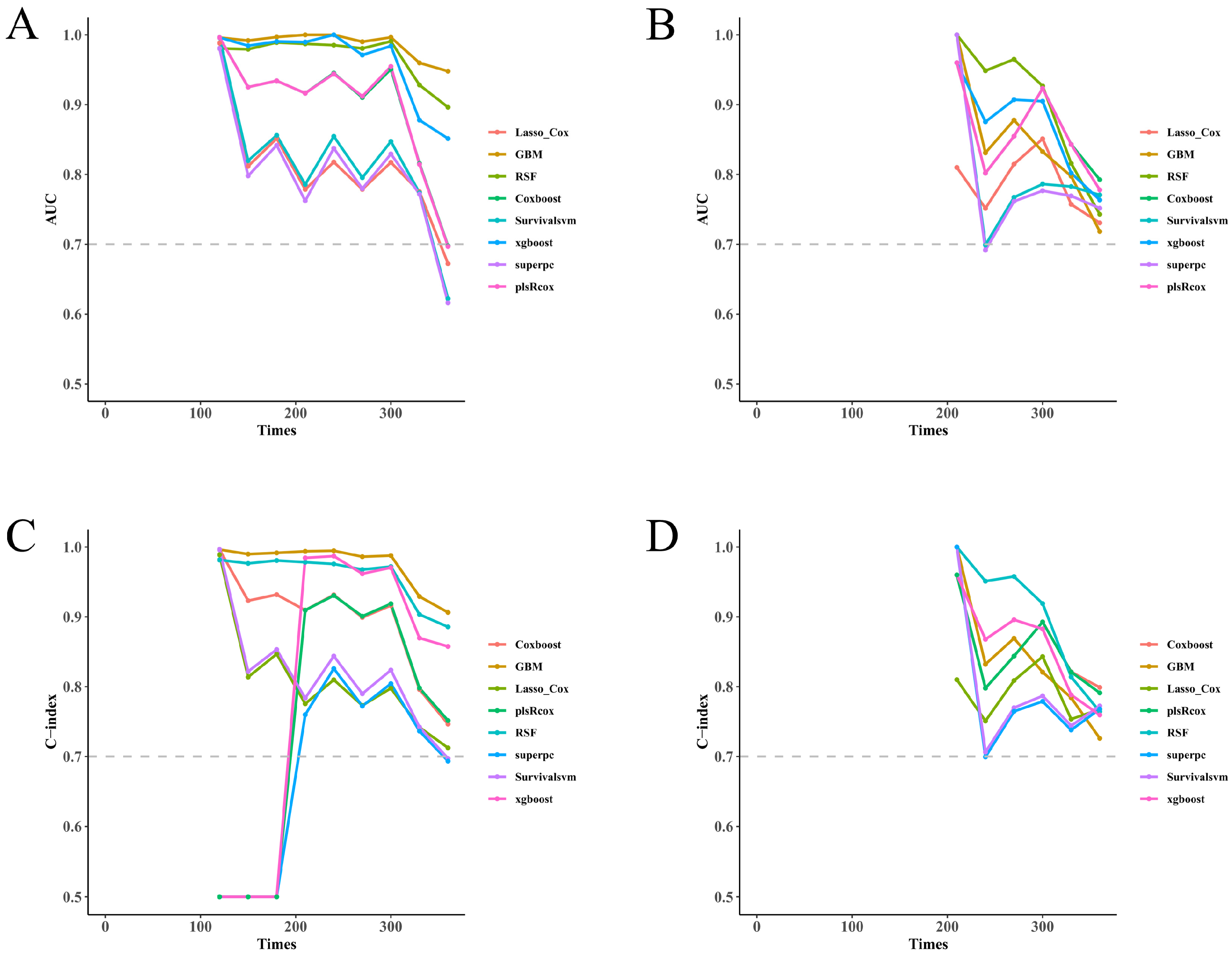 Figure 5A–D). Risk scores derived from each model stratified patients into distinct PTS-free survival groups over follow-up (