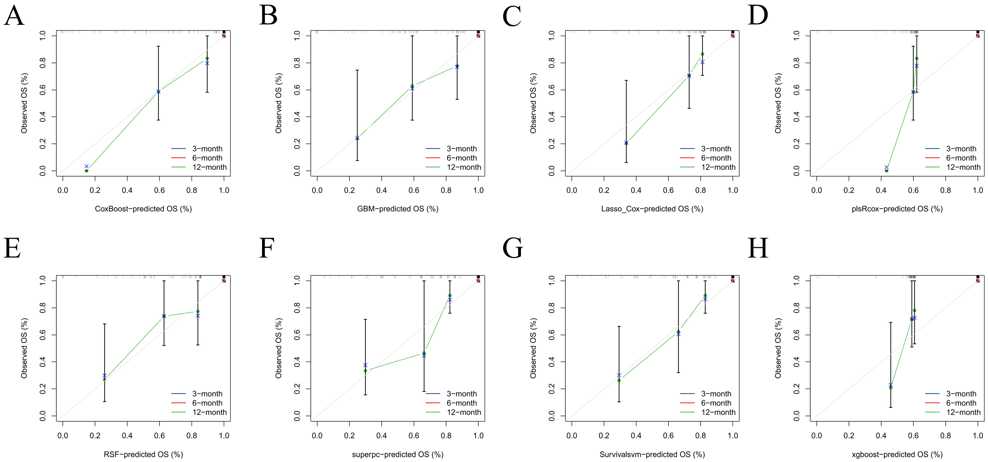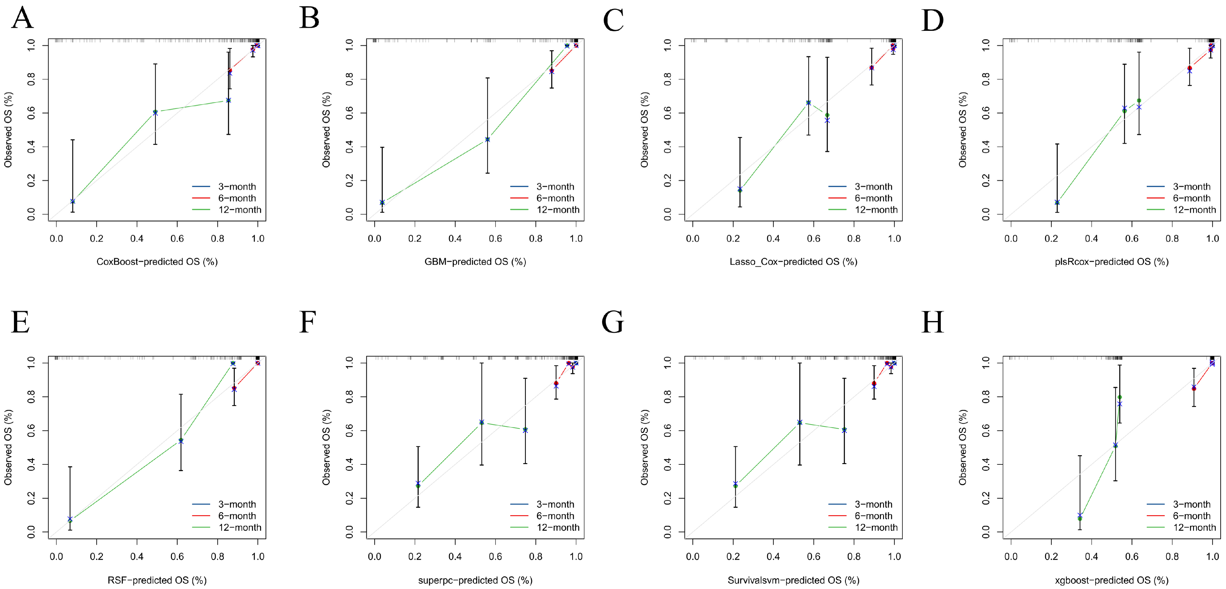 Figure 6A–D). Predicted absolute risks corresponded well with observed outcomes at the prespecified horizons of 3, 6, and 12 months, indicating satisfactory calibration in both cohorts (