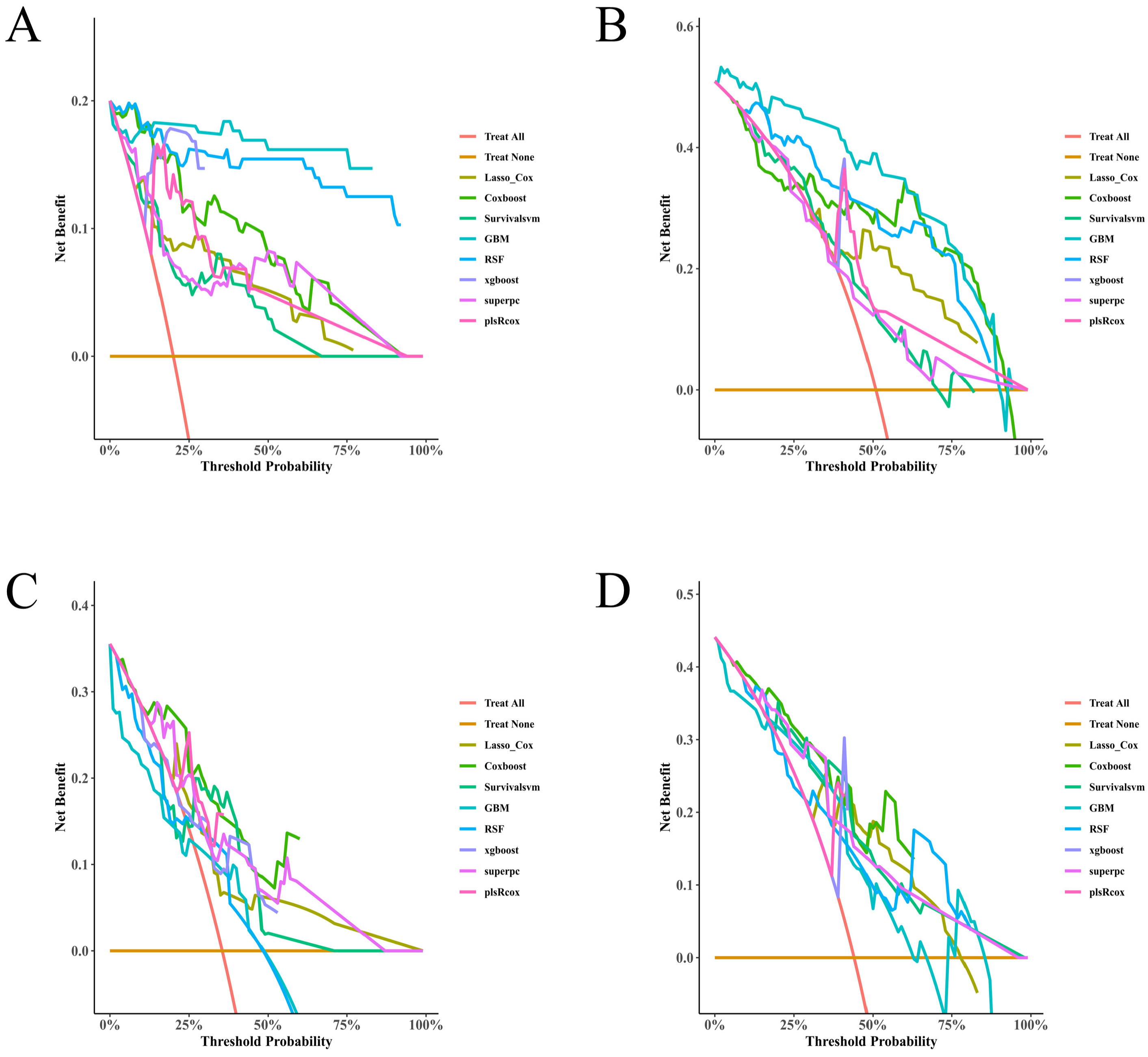 Figure 4). Decision-curve analysis suggested positive net benefit for the top-performing models across clinically plausible thresholds, supporting the concept that model-based risk estimates could inform follow-up intensity and supportive care (