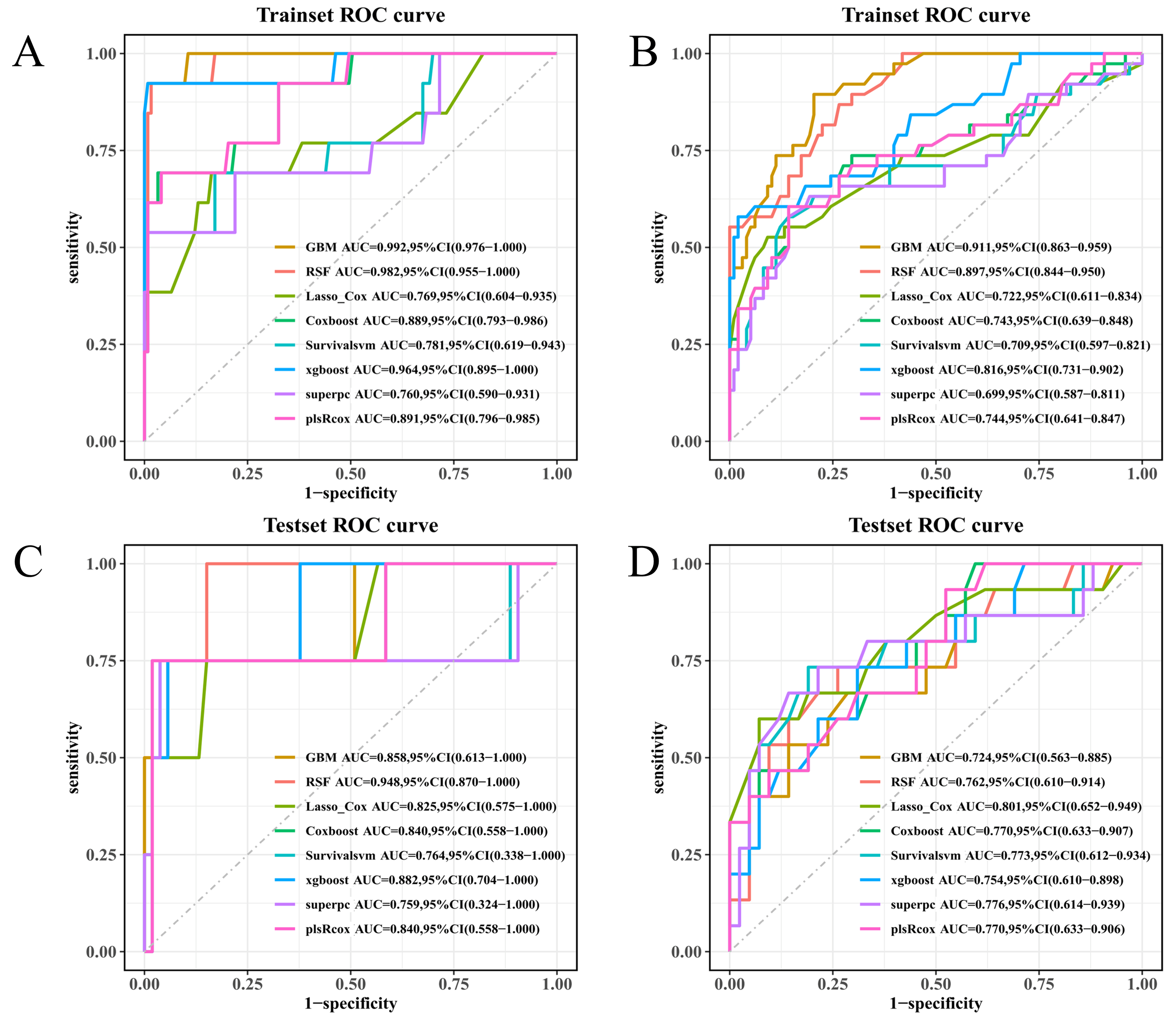 Eight survival learners were trained in the training set using 10-fold cross-validation for tuning/selection, with a fixed random seed (set.seed(123)) across pipelines. For Random Survival Forest (RSF), we used rfsrc with ntree = 1000, nodesize = 3, mtry = 2, splitrule = “logrank”, and enabled importance, proximity, and forest objects. Gradient Boosting Machine (GBM) (gbm, distribution = “coxph”) used n.trees = 1000, interaction.depth = 5, n.minobsinnode = 3, shrinkage = 0.01, and cv.folds = 10 (parallel cores as available). LASSO + Cox employed glmnet (alpha = 1, maxit = 1000), with 10-fold CV (λ_min and λ_1se) for penalty selection consistent with our LASSO CV plots. CoxBoost penalties were optimized via optimCoxBoostPenalty (start.penalty = 200), and the number of boosting steps chosen by 10-fold cv.CoxBoost (maxstepno = 200, type = “verweij”); the final model was refit with stepno = cv.optimal and the selected penalty. For survivalsvm, we used a linear kernel (kernel = “lin_kernel”) with gamma.mu = 0.1, opt.meth = “quadprog”, diff.meth = “makediff3”, sgf.sv = 5, sigf = 7, maxiter = 100, margin = 0.05, bound = 10. XGBoost (Cox) used a tree booster with objective = “survival:cox”, eval_metric = “cox-nloglik”, eta = 0.03, max_depth = 3, subsample = 1, colsample_bytree = 1, gamma = 0.5, nrounds = 100, and early_stopping_rounds = 50. superpc was trained with s0.perc = 0.5 and cross-validated using n.fold = 10, n.threshold = 20, n.components = 3 (with min.features = 5, max.features set to all available, and full CV/prevalidation enabled). For plsRcox, component selection used 10-fold CV up to nt = 10, yielding a final model with nt = 3; risks were then predicted for both training and test sets. To aid interpretability, we examined LASSO coefficient paths and RSF permutation/Gini importance to summarize variable contributions across linear-penalized and tree-based learners. Final models were refit on the full training data using the selected hyperparameters and then evaluated once in the test set without further tuning.