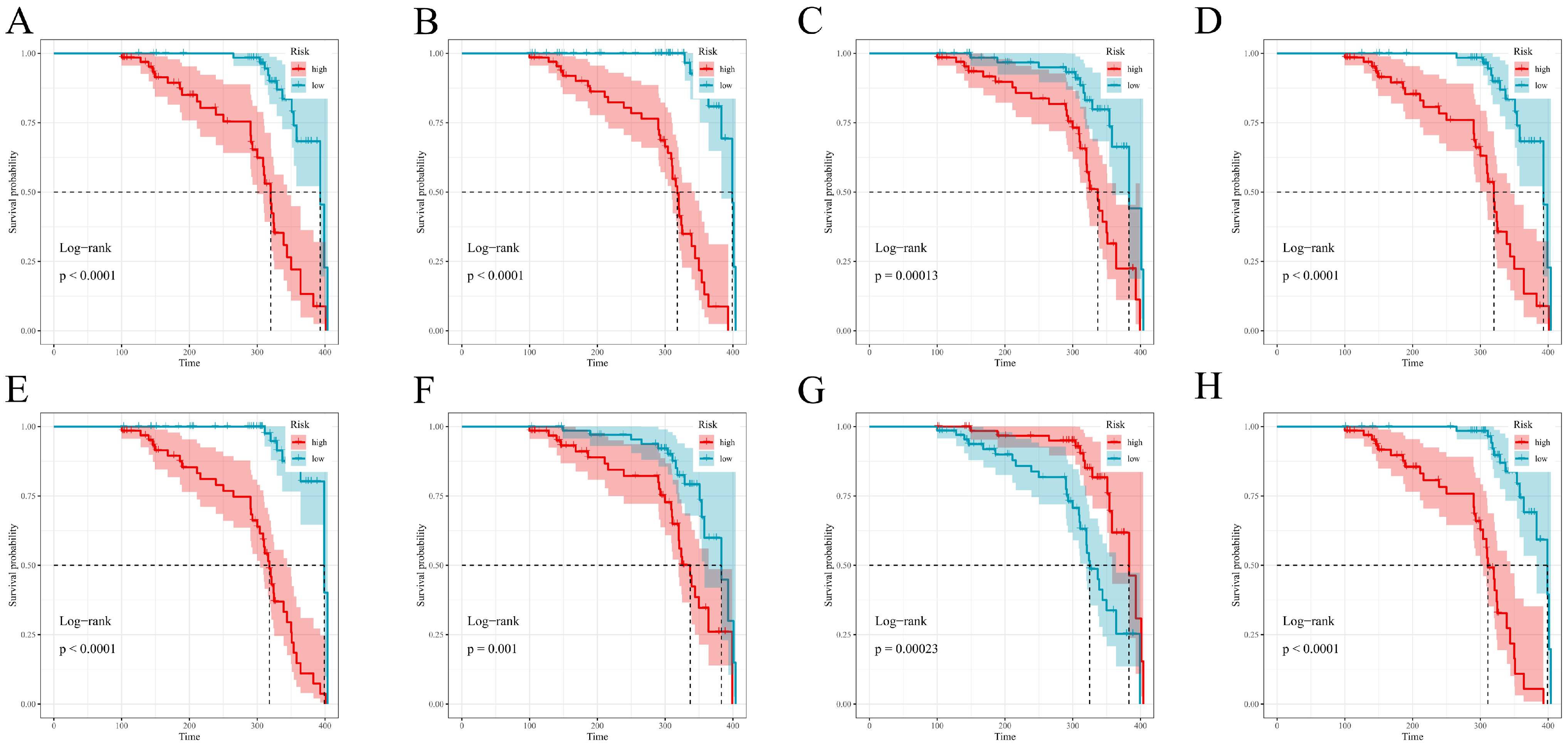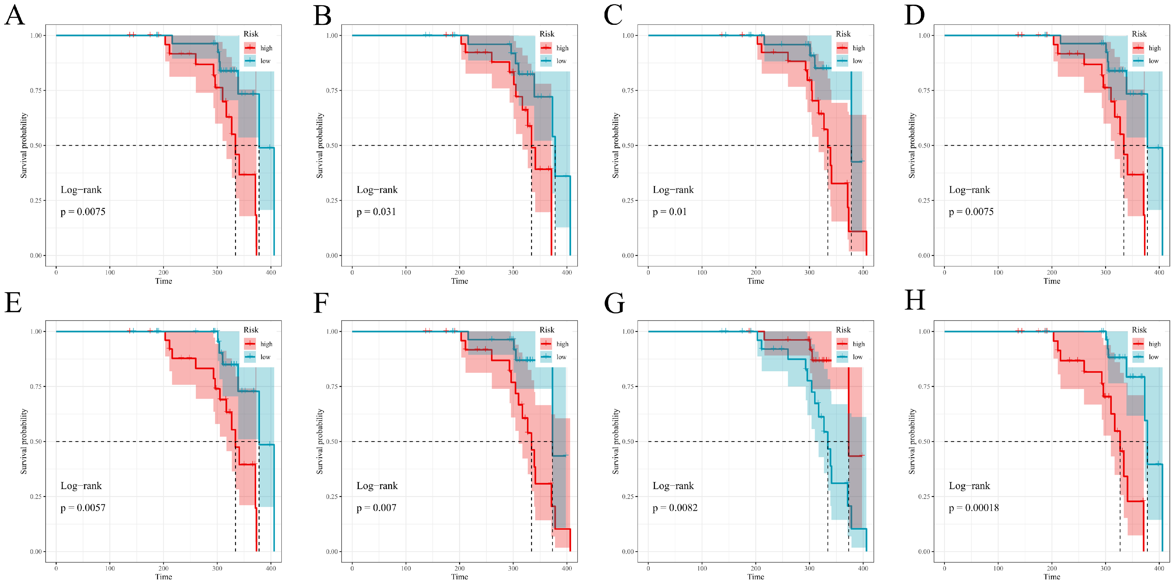 For each fitted model, we computed an individual risk score. Risk groups were defined separately within both the training and test cohorts; the cohort-specific median of said score formed the definition of high vs. low groups. Survival functions for these groups were estimated using Kaplan–Meier methods with associated Greenwood standard errors; two-sided log-rank tests served as the means of comparison. Plots were generated via survminer::ggsurvplot with near-identical, consistent options: conf.int = TRUE, pval = TRUE (pval.method was also set to true), surv.median.line = “hv”, legend.labs = c(“high”,”low”), and ggtheme = theme_bw(), a simple two-color palette; risk tables were suppressed. Time origin, censoring rules, and follow-up all matched the primary analysis. All computations took place in R (version 4.5.0); survival, survminer, glmnet, randomForestSRC, CoxBoost, survivalsvm, gbm, xgboost, riskRegression, pec, timeROC, pROC, superpc, and plsRcox, and mice were among the packages used. Reproducibility was a primary concern: set.seed(123) was applied across all pipelines, full hyperparameter grids archived, and/or analysis environments frozen (version controlled). De-identified data and scripts are stored securely on institutional servers to allow for perfect reruns of all analyses.
