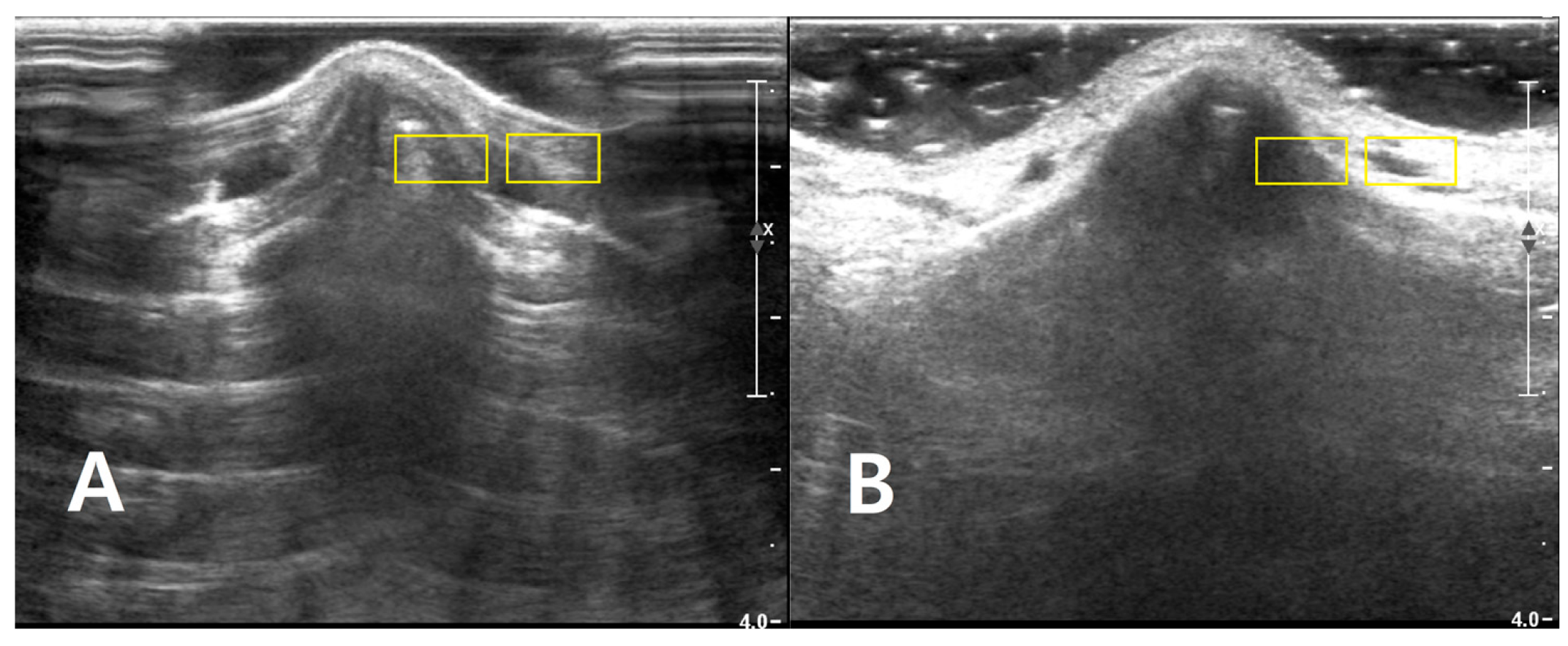 Figure 2). The exact lateral position of the ROIs was adjusted so that, in both PAD and LGB images, ROI_bone and ROI_soft remained aligned to the same anatomical level (depth mismatch ≤ 0.5 mm; angular mismatch ≤ 5°). For subjects with cine data, the same ROIs were propagated across five consecutive frames: the frame with the highest mean intensity within ROI_bone and its two preceding and two subsequent frames. For each frame, the mean (μ) and standard deviation (σ) of the 8-bit gray-level values were recorded for ROI_bone and ROI_soft. For subjects with only static images available, ROI_bone and ROI_soft were repositioned across three to five adjacent locations along the same cortical segment, and measurements were averaged (