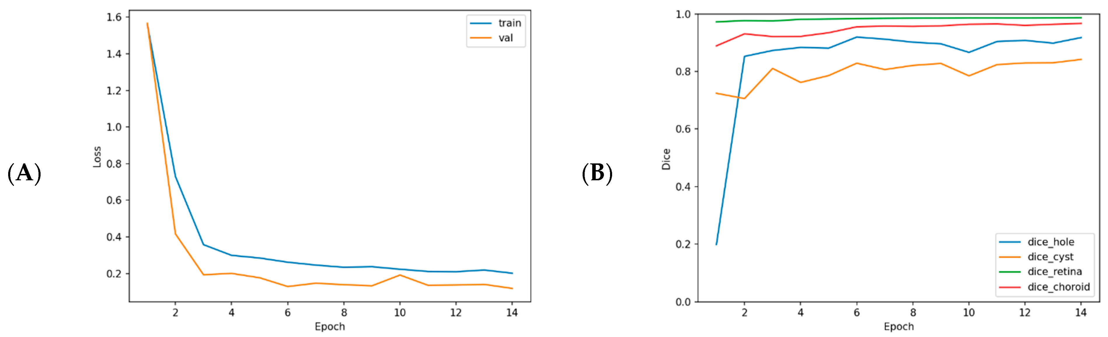 Figure 3 presents the training and validation curves and the per-class Dice evolution across epochs.