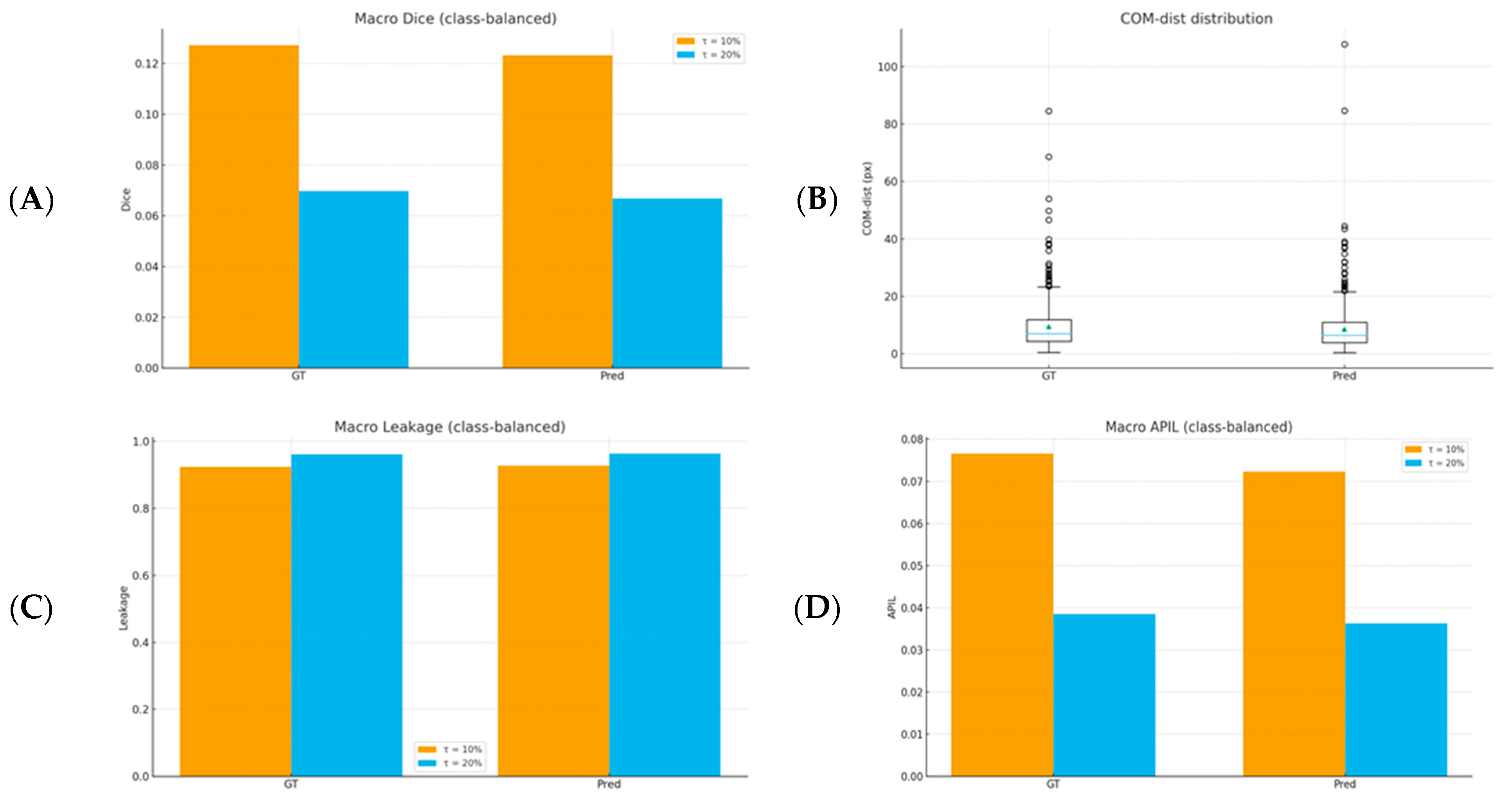 Table 6). As τ increased from 10% to 20%, the top-τ area increased, while Dice and APIL decreased and Leak increased; COM-dist remained lower in Pred mode (