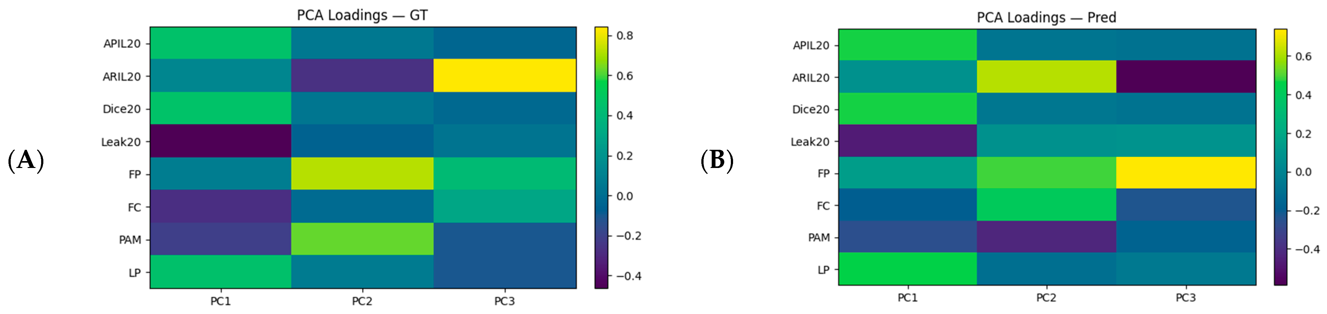 Three components emerged from the factor analysis: PC1 represents the contrast between focus/coverage and leakage (positive APIL and DICE, negative Leak); PC2 captures intraretinal localization and spatial proximity (ARIL and FP positive); and PC3 reflects pure focus without size effects (FP dominant). The GT and Pred patterns were similar. Loadings were more pronounced in Pred, particularly in PC3, suggesting a relatively stronger representation of the focus component in the model descriptions (