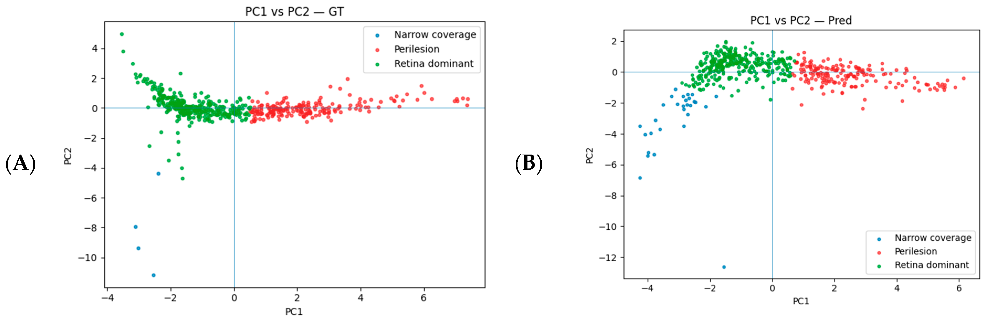 n = 79) cluster in GT mode showed the highest intraretinal coverage (ARIL20 = 0.684) with relatively lower leakage (Leak20 = 0.917). Meanwhile, the COM-dist of 16.22 px and FP of −0.21 indicate a shift in focus to the peri-lesion region; the large area (LP = 6487.4 px) supports this pattern. In the retina-dominant cluster (