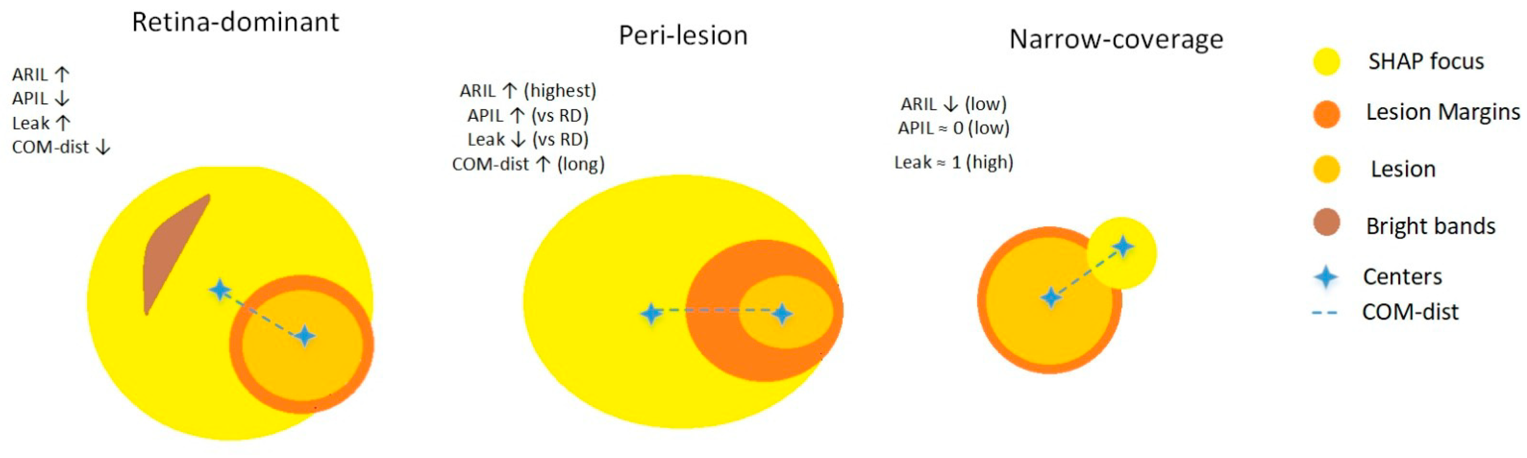 n = 113) cluster reflected a peripheral focus in large lesions (LP = 4386.4 px) with an ARIL20 of 0.719, Leak20 of 0.940, COM-dist of 10.17 px, and FP of −0.16. The retina-dominant (