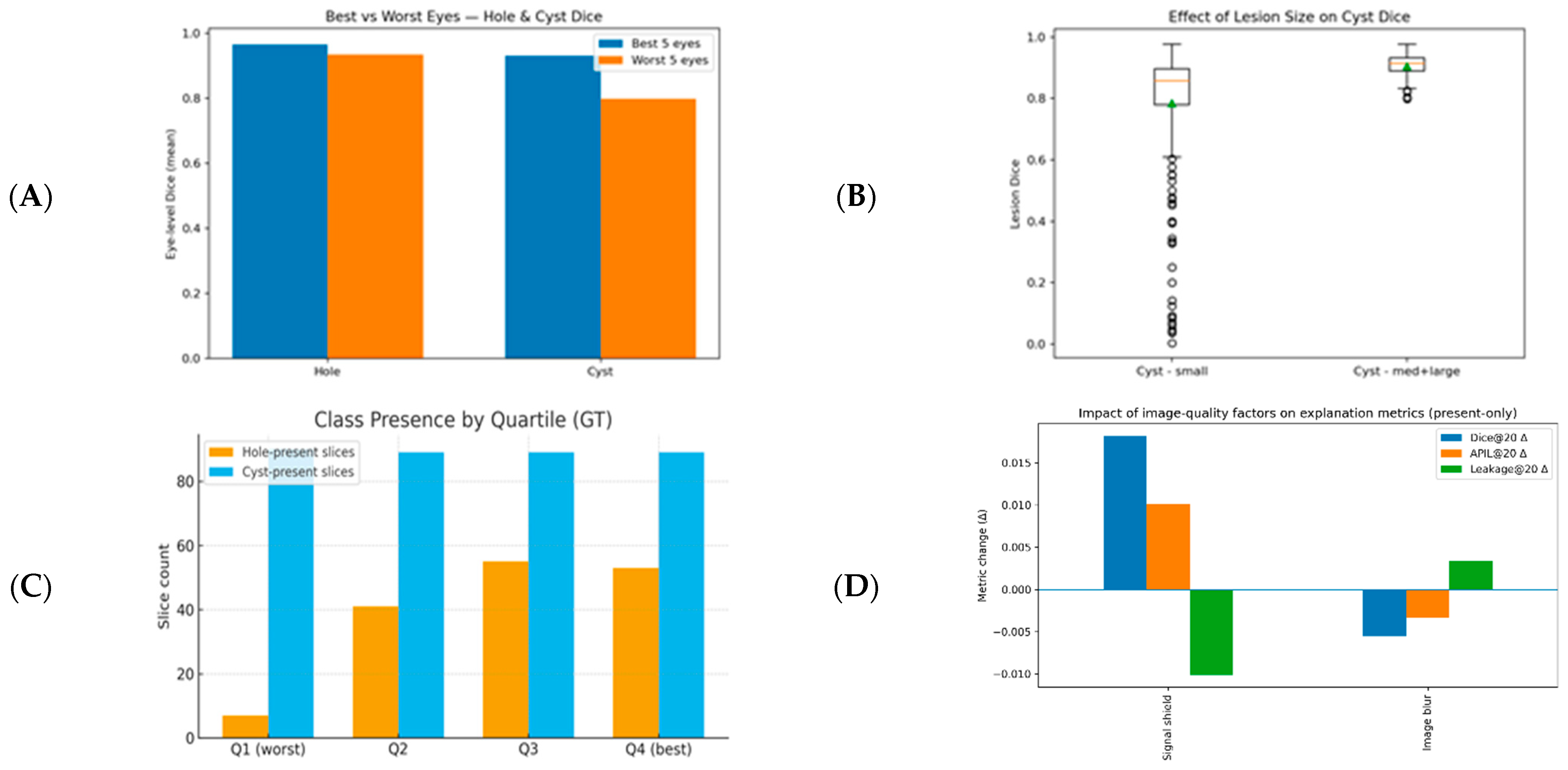 In the best–worst eye comparison, the Dice score for holes was stable with an approximately 3% difference between the best and worst eyes, whereas cyst Dice decreased by approximately 13%. The performance loss was therefore primarily driven by cysts. In small cysts (n = 252), Dice = 0.784 ± 0.202; in medium/large cysts (n = 118), it was 0.906 ± 0.036, yielding Δ = −0.122 (Cohen’s d = −0.73).