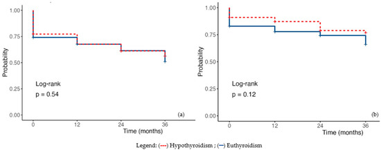 Using univariate regression to estimate survival at 12, 24, and 36 months, patients with hypothyroidism did not demonstrate statistically significant differences compared with euthyroid individuals (HR 0.88, 95%CI 0.58–1.33, p = 0.533). Analysis of cardiovascular-related mortality confirmed these findings (HR 0.62, 95%CI 0.32–1.13, p = 0.119) (Figure 3a,b).