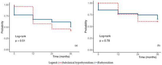 Kaplan–-Meier Survival Plot in hypothyroidism (a) Overall mortality; (b) Cardiac mortality. Legend: (---) subclinical hypothyroidism; (—) euthyroidism.