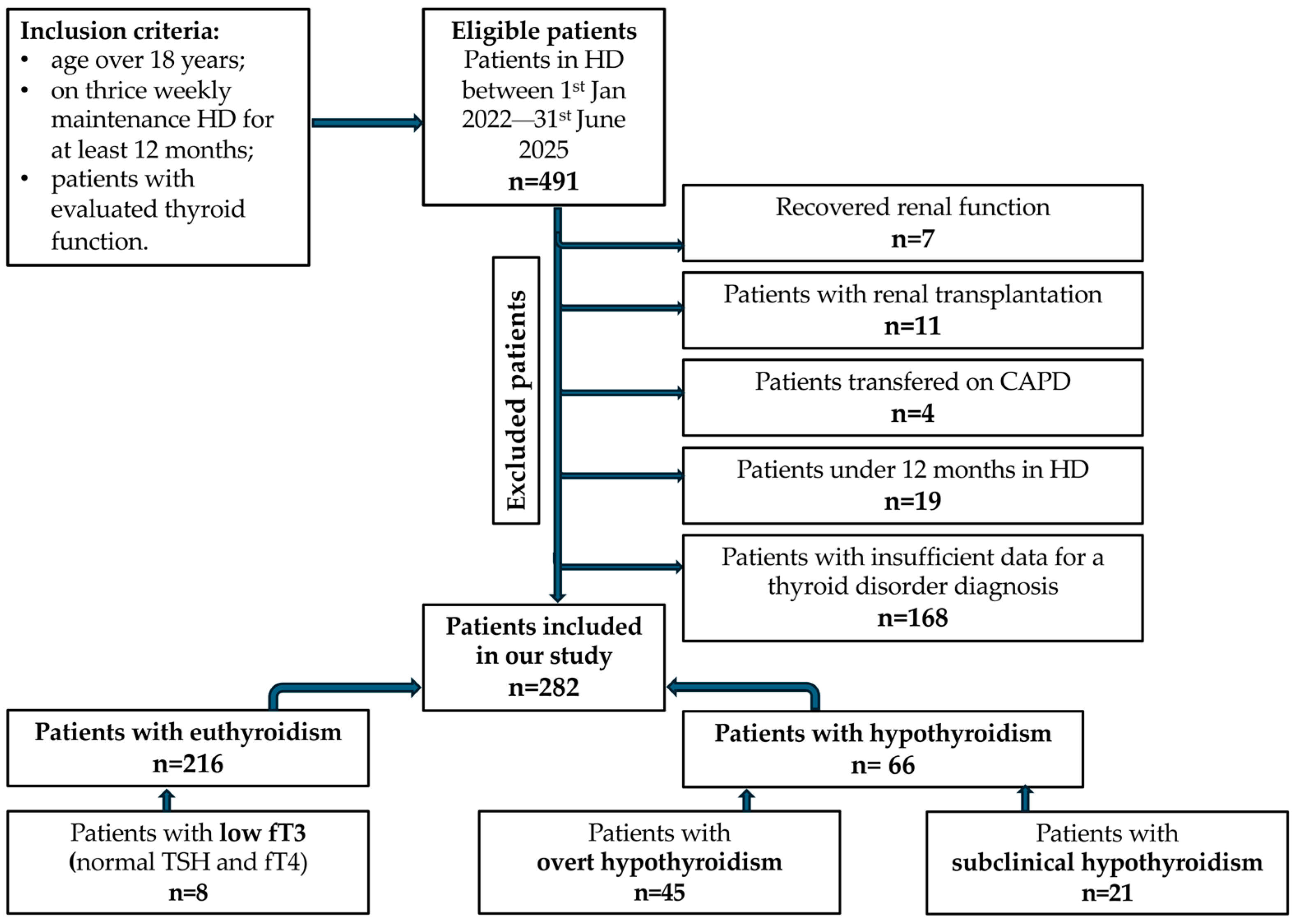 - Jameel Memon, H.; Das, B.; Naveed, A.N.; Memon, R.; Memon, S.; Kumar, S. Prevalence of Hypothyroidism in Esrd Patients with Maintenance Hemodialysis: Hypothyroidism in Esrd Patients with Maintenance Hemodialysis. Pak. BioMed. J. 2022, 5, 174–177. [Google Scholar] [CrossRef]